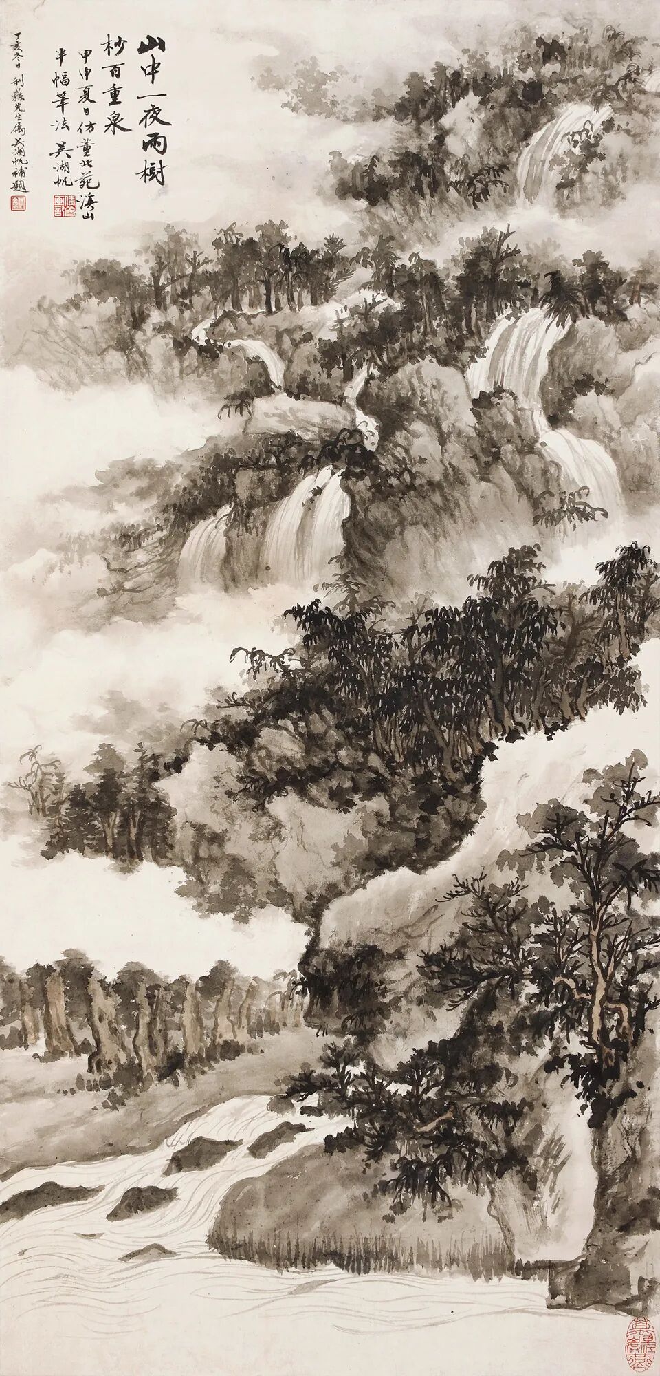 吴湖帆此幅水墨雨景山水作于甲申(1944年)夏日,拟南唐董北苑溪山半幅笔法。画上题诗“山中一夜雨,树杪百重泉”语出唐王维的《送梓州李使君》,意为山里昨晚不停地下了透夜的春雨,树梢淅淅沥沥活像泻着百道清泉。此画描绘深山冥晦,千岩万壑中雨水降临的境况,雨中山间道道飞泉,悬空而下,泉瀑就如同从树梢上倾泻下来似的,动态十足。画面布景十分繁密,水气氤氲,云雾显晦,景物朦胧。画中山川景物的层次、纵深、高远在墨的浓淡和画面的虚实、黑白变化中尽现,把人带入到一个雄奇、壮阔而又幽深的境界,实为吴湖帆画艺成熟期之山水画佳作。