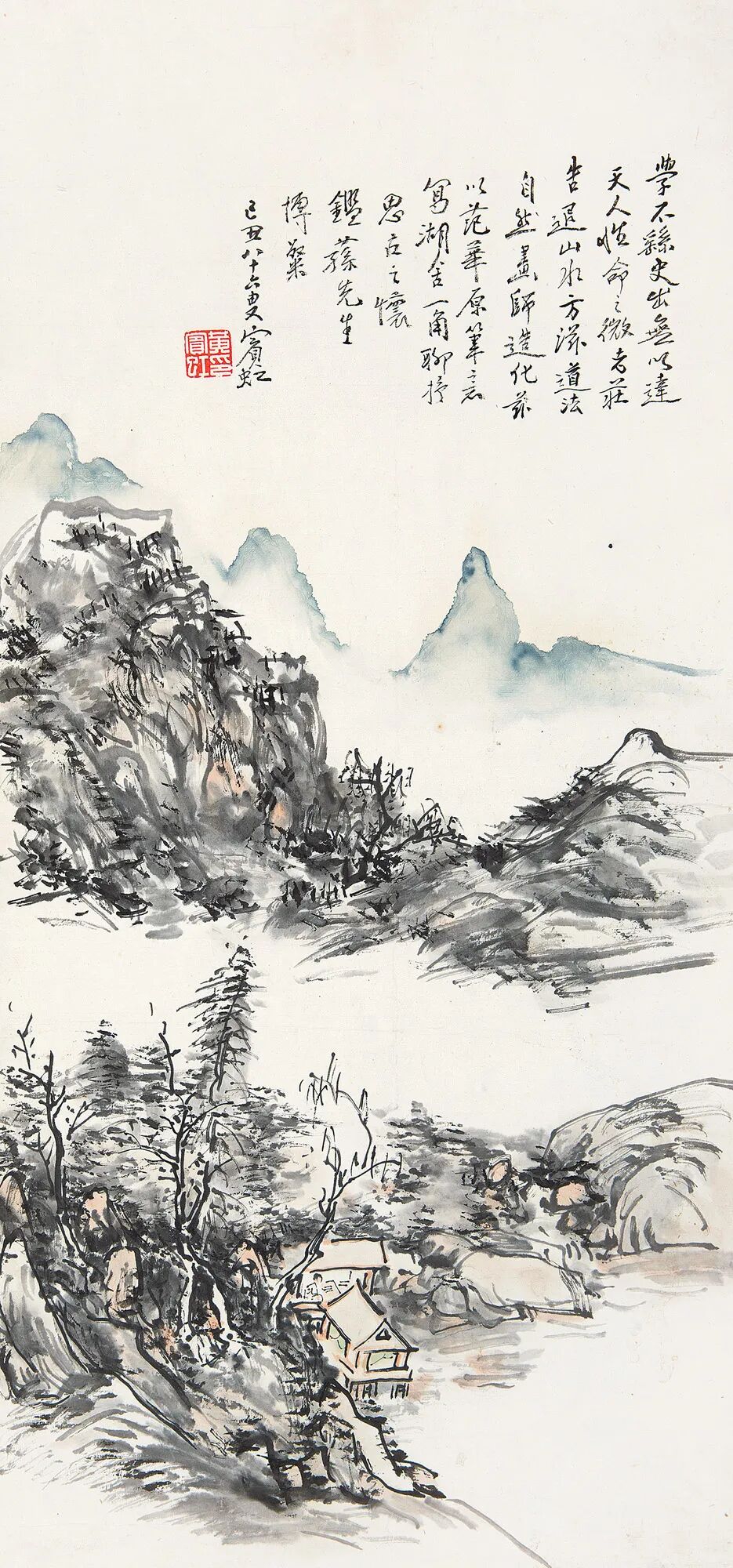 题识:学不繇史出,无以达天人性命之微。老庄告退,山水方滋。道法自然,画师造化。兹以范华原笔意写湖舍一角,聊抒思古之怀,鉴荪先生博粲,己丑八十六叟,宾虹。
