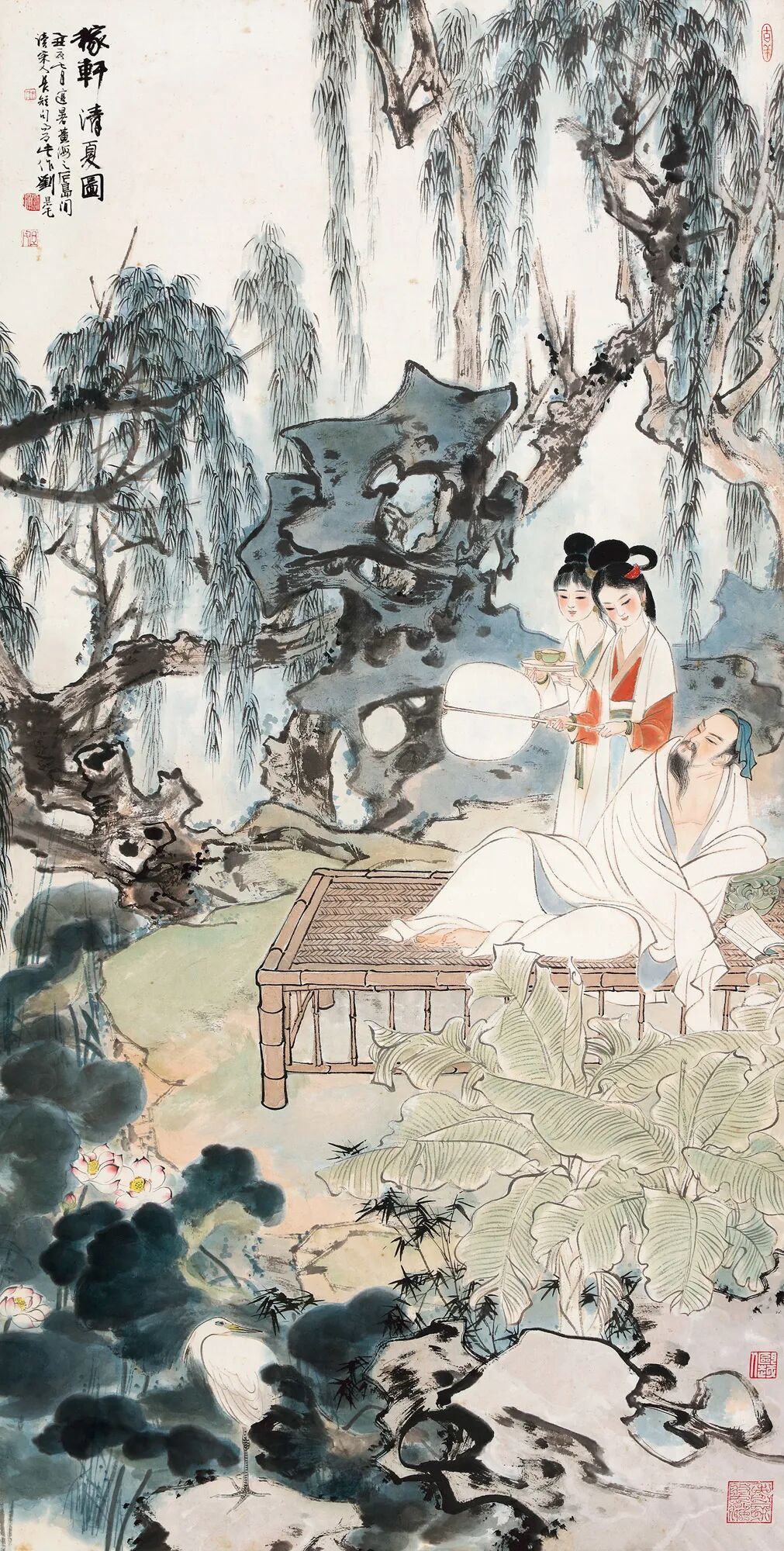 此幅《稼轩消夏图》乃是乙丑(1985年)所作,写的是辛弃疾夏日消暑的故事。画中稼轩斜躺竹席之上,美髯凸肚,一派古风清貌;一旁侍女纨扇端茶,蕉荫垂柳,荷花盛开,盛夏的季节气息扑面而来。此作画面疏朗大气,设色清润,用笔轻松,线条流畅疏朗,人物开相亦颇具古意。整幅画面融工笔、线描、和小写意为一体,秀拙相藴,生动雅健,风格别具。画中取古典题材,运之以工写合一技法,让赏画者在心中之境与眼前之景相合之时,油然而生思古之幽情,这无疑体现出刘旦宅绘画的非凡境界,承继了传统文人画的高雅之趣,却没有文人画中那股陈腐之气,是新时代的文人画,突出了刘旦宅连环画的深厚功底。
