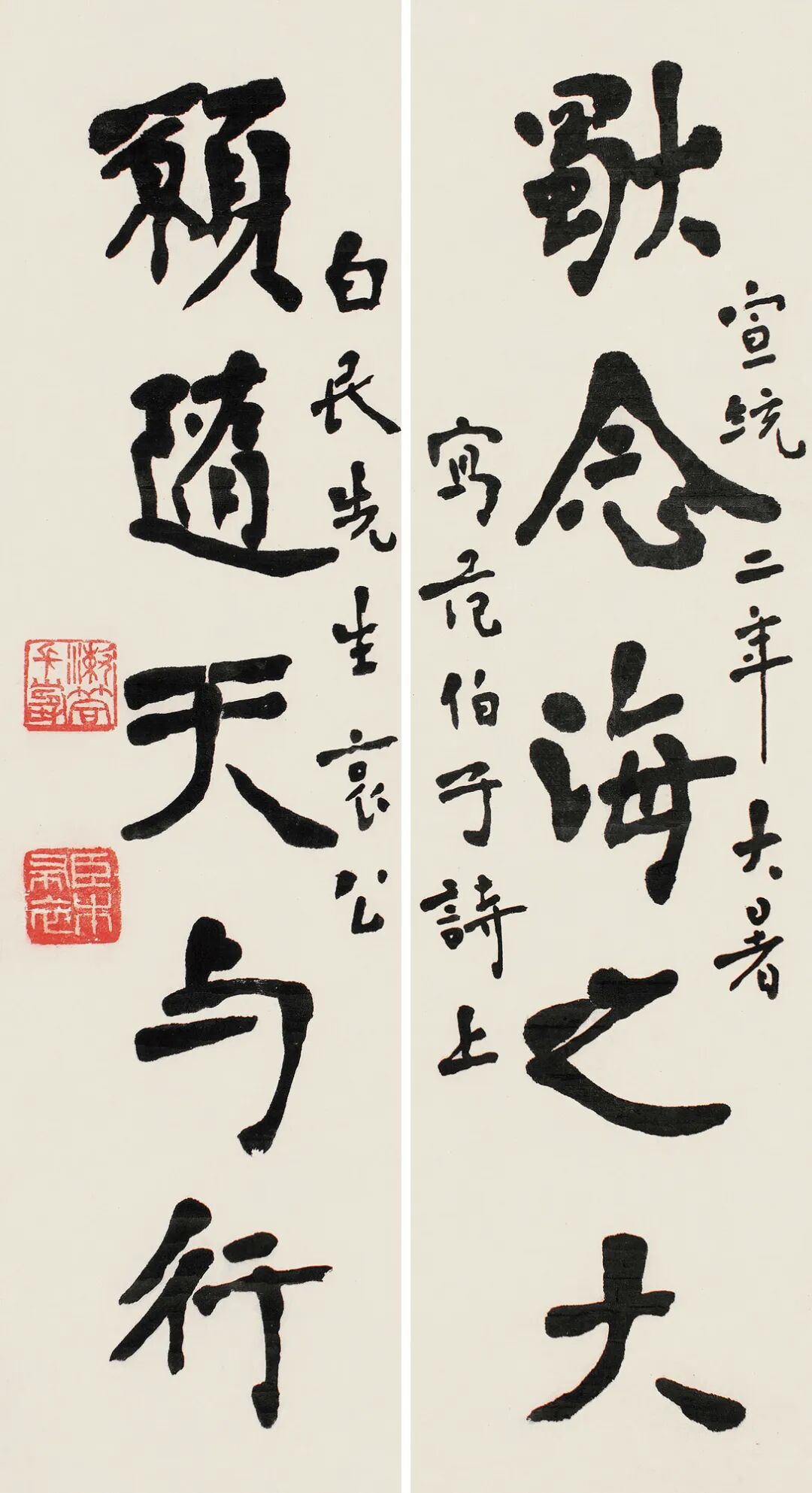 此幅楷书五言联是弘一法师在1910年时为好友杨白民所做,不仅书法雄浑有力,内容亦饱含深意。当代著名书画家范曾在文章中写道:“(弘一)1910年(宣统二年)学成归国,就是这一年他曾书写我曾祖范伯子的诗句‘独念海之大,愿随天与行’给杨白民;弘一所以对范伯子的诗敬慕,除去先曾祖诗的雄奇恣肆的魅力外,还由于他与先祖父范罕先生同时游学于日本,视为莫逆。”
