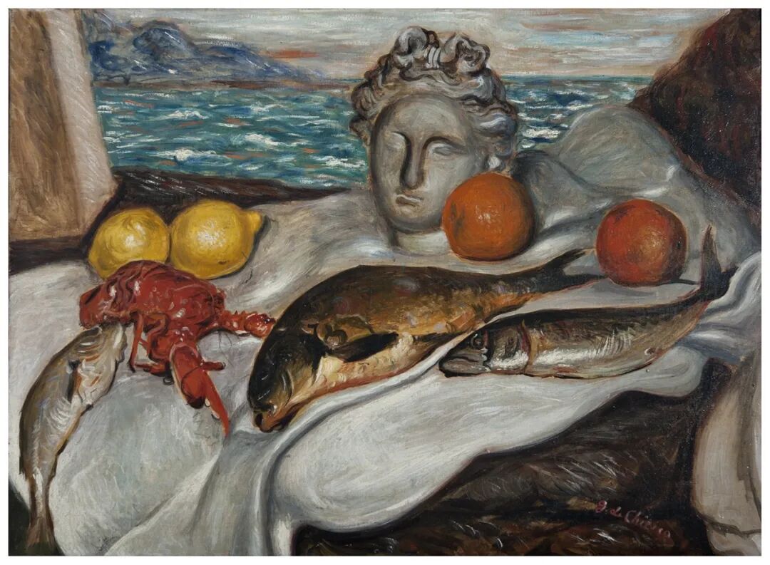 在基里科的作品里,我们常常能看到诺大建筑、空旷的广场、孤独的石膏像、拉长的阴影,突兀的静物。《静物与鱼》采用经常出现的静物素材,却营造出古典的氛围;取材于古希腊《荷马史诗》的《赫克托告别安德洛玛刻》,这一主题及“告别”主题,一直贯穿于画家的系列作品中;《自画像》展现了艺术家重新转向古典肖像学的复古感,画面席卷复杂而巨大的情绪,令人着迷。