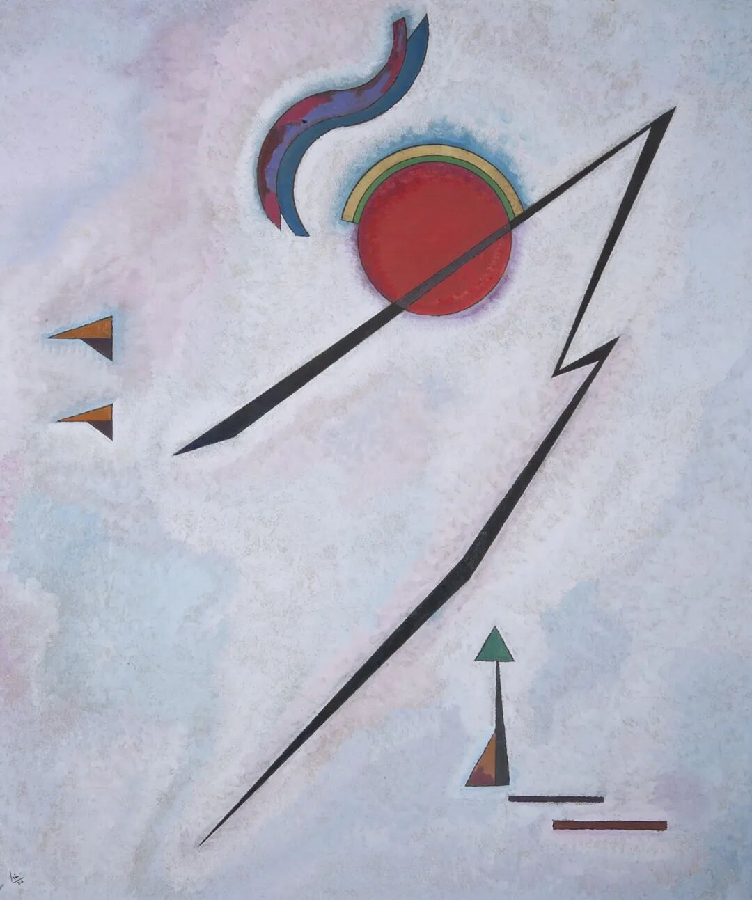 由于从小就学习大提琴,康定斯基在他的抽象艺术实践中,充分结合了音乐与绘画的特征。每一种颜色,不同位置与形态的点、线、面都是表达音乐情绪与内心情感的途径。黄色像小号的声音般尖锐,朱红如同击鼓一样热情,贯穿画面的对角线则带有强烈的冲击感。