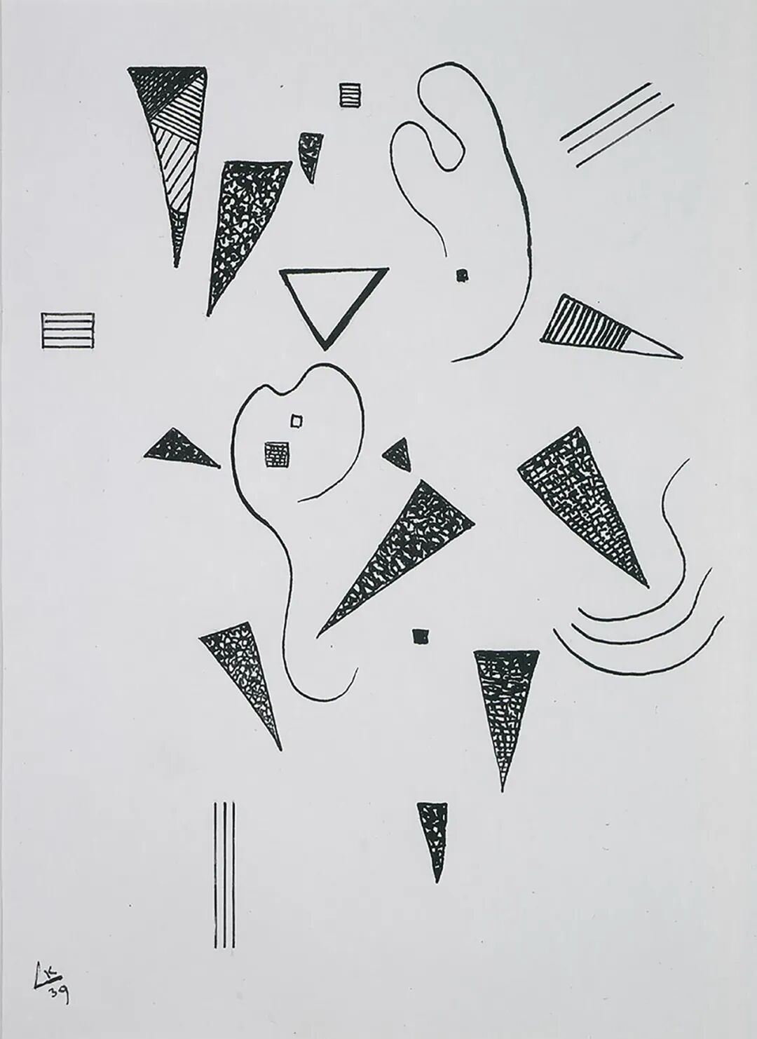 本次展览将展出康定斯基的三幅佳作。《成角的线条》是其早期作品,吸收了包豪斯的主题和元素,并且总体上采纳了欧洲非具象艺术的新语汇,《雅科夫斯基小品24篇》是为1935年巴黎出版的《雅科夫斯基小品24篇》豪华版而创作,《无题》则是画家在1939年夏至1942年春德国占领期间创作的系列草稿的一部分。三件作品中对点、线、面及色彩的灵活运用都带着强烈的康定斯基式特质,看似寥寥几笔,却饱含磅礴的情感,表现出强大的艺术张力。