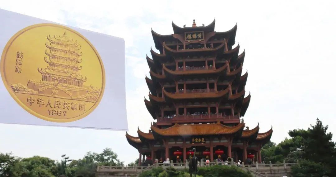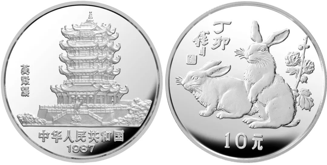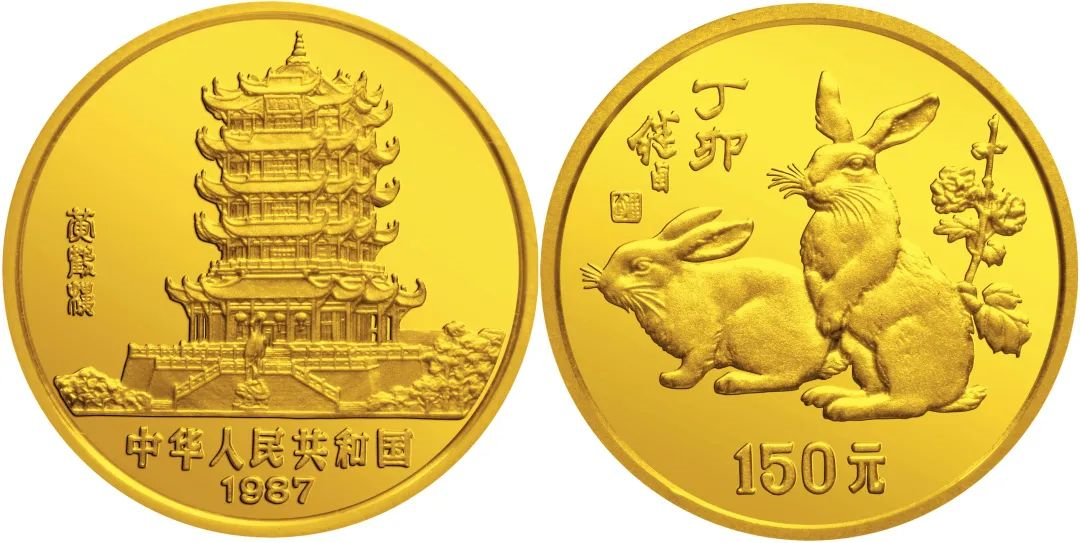 金银纪念币正面图案均为武汉黄鹤楼,背面图案为刘继卣所绘《双兔图》。