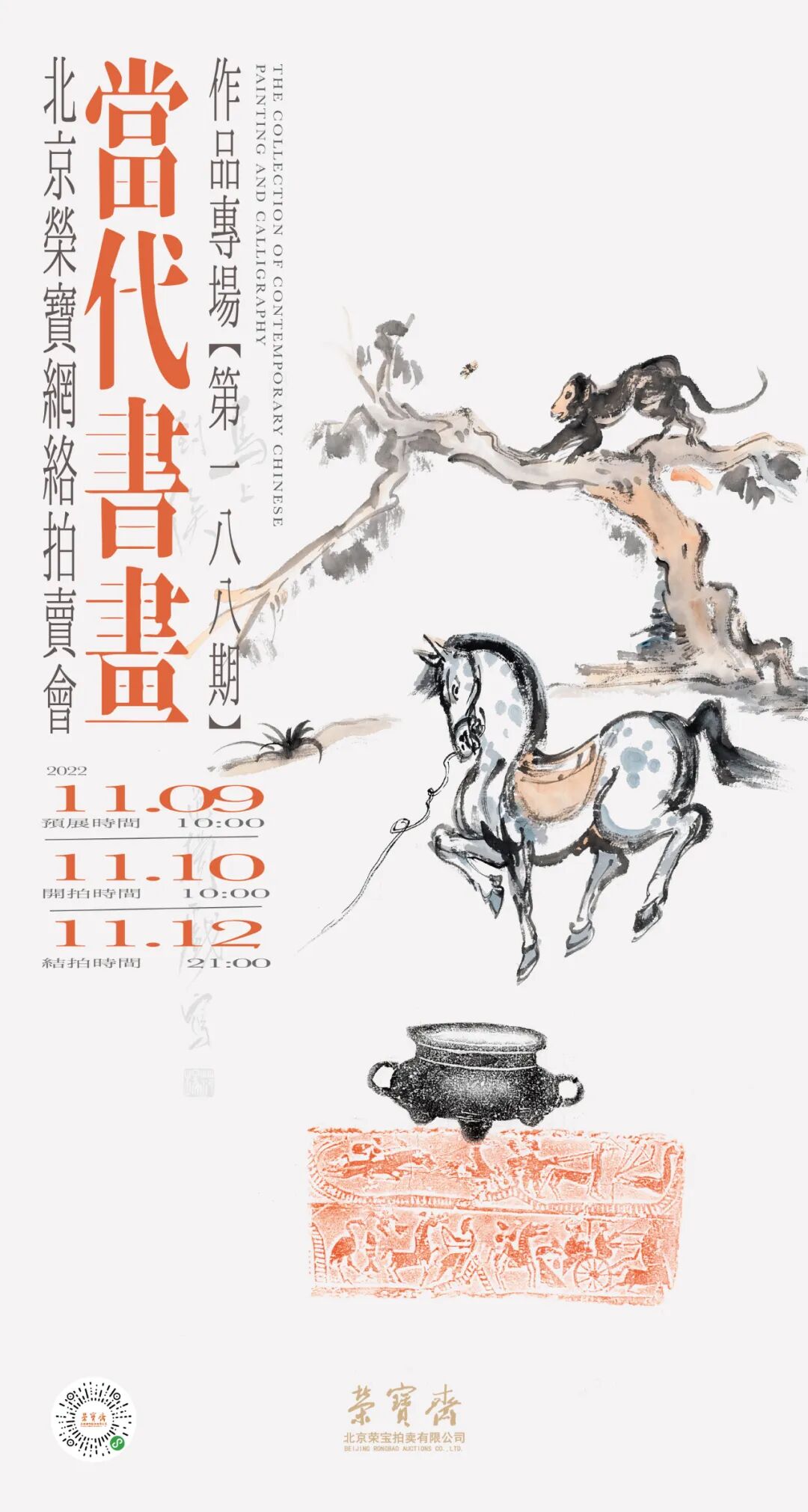 北京荣宝·当代书画作品专场网络拍卖会(第一八八期)将于11月9日10:00-11月10日10:00开启线上预展,并于11月10日10:00开拍,11月12日21:00结拍。
