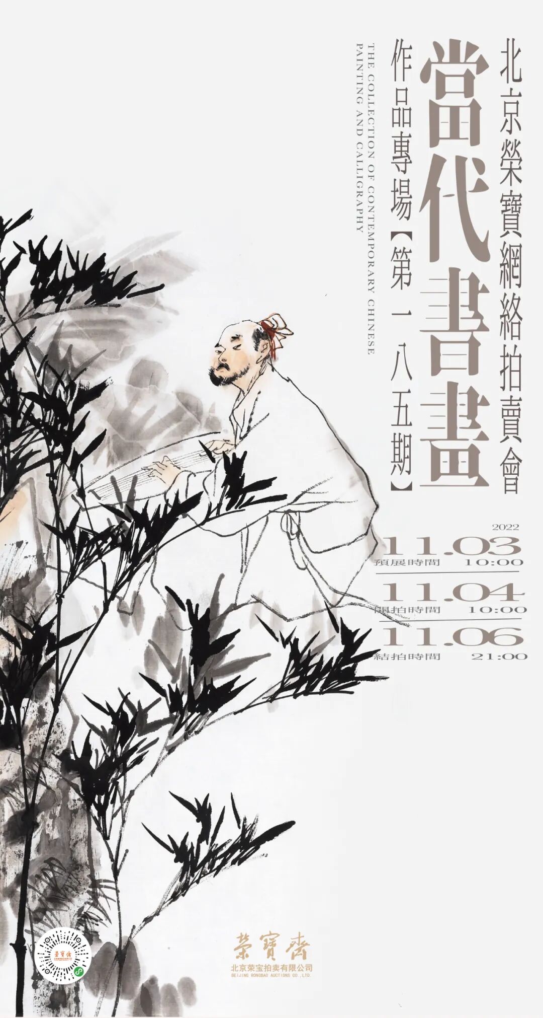北京荣宝·当代书画作品专场网络拍卖会(第一八五期)将于11月3日10:00—11月4日10:00开启线上预展,并于11月4日10:00开拍,11月6日21:00结拍。