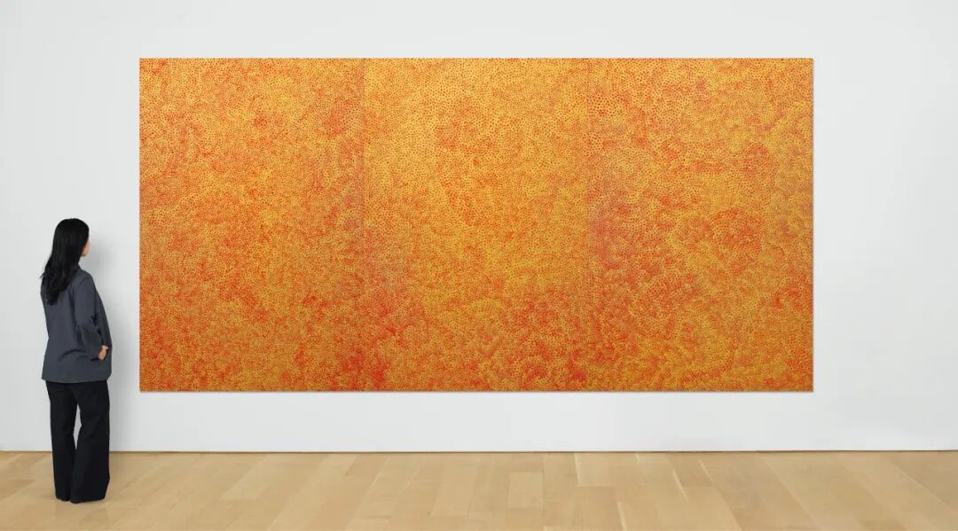 年届七旬的草间弥生创作了这幅三联巨作《无限之网(TWHOQ)》,画面上无边无际的网是她60年艺术生涯中的标志性题材。草间用金黄与朱红的璀璨色彩化作太阳般的温暖炙热,召唤出宇宙无穷的生命力,并不断地在这股力量的引领下走向永恒。