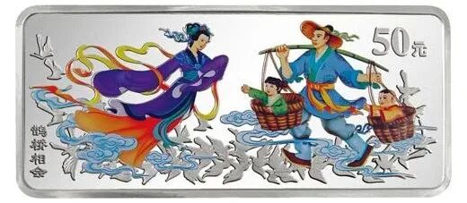 说到七夕,最先令人想到的便是牛郎织女故事。在2003年央行发行的中国民间神话故事纪念币中,5盎司的《牛郎织女》彩色纪念银币最为传神,其背面刻画了牛郎织女一年一度鹊桥相会的情景,不仅表达了两人情比金坚的爱情,更加向人们传递了爱情来之不易,且行且珍惜的铭心主题。