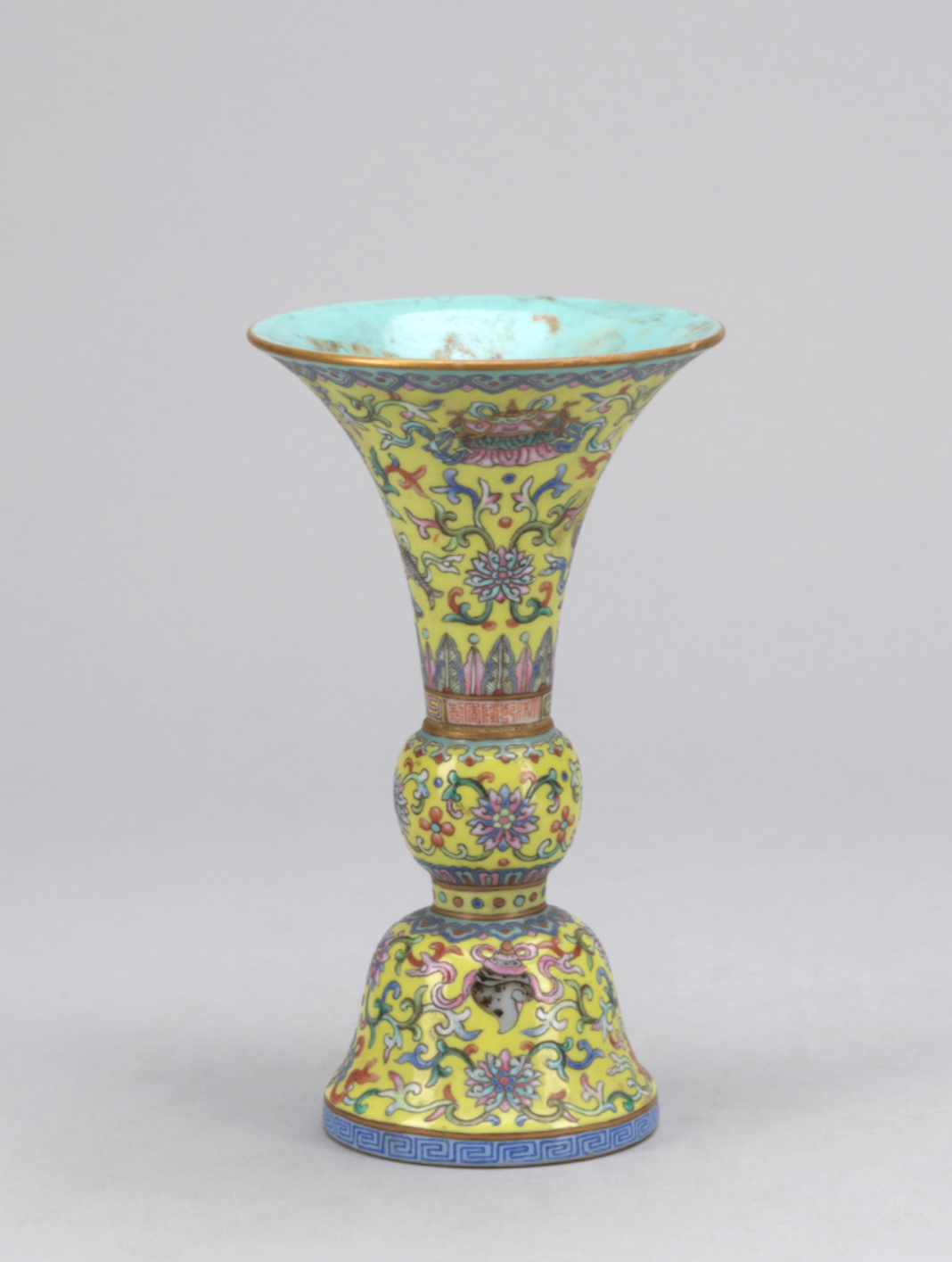 乾隆款黄地粉彩八宝勾莲纹五供-花觚
