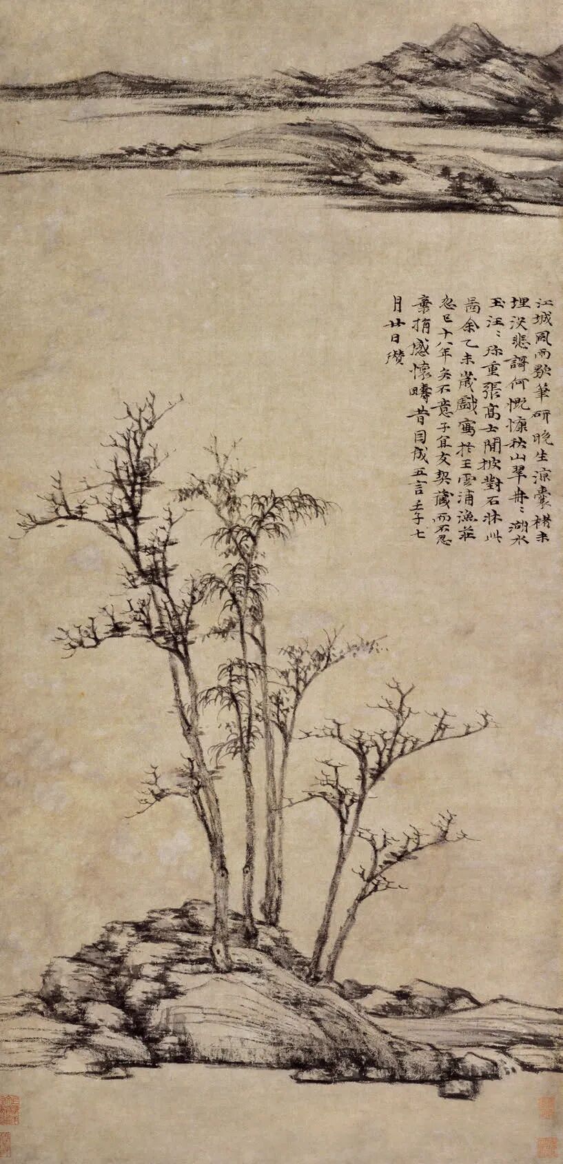故宫博物院藏其《林亭远岫图》,题作于癸丑(一三六三)夏五月初十。虽是盛夏,画中却是枯槎当立,学李成法,以湿笔画出的碎枝,更见冷寒之状。远目遥岑,也是气象萧森。颇有他评李成画所言“林木苍古,山石浑然,径岸萦回,自然趣多”的意味。