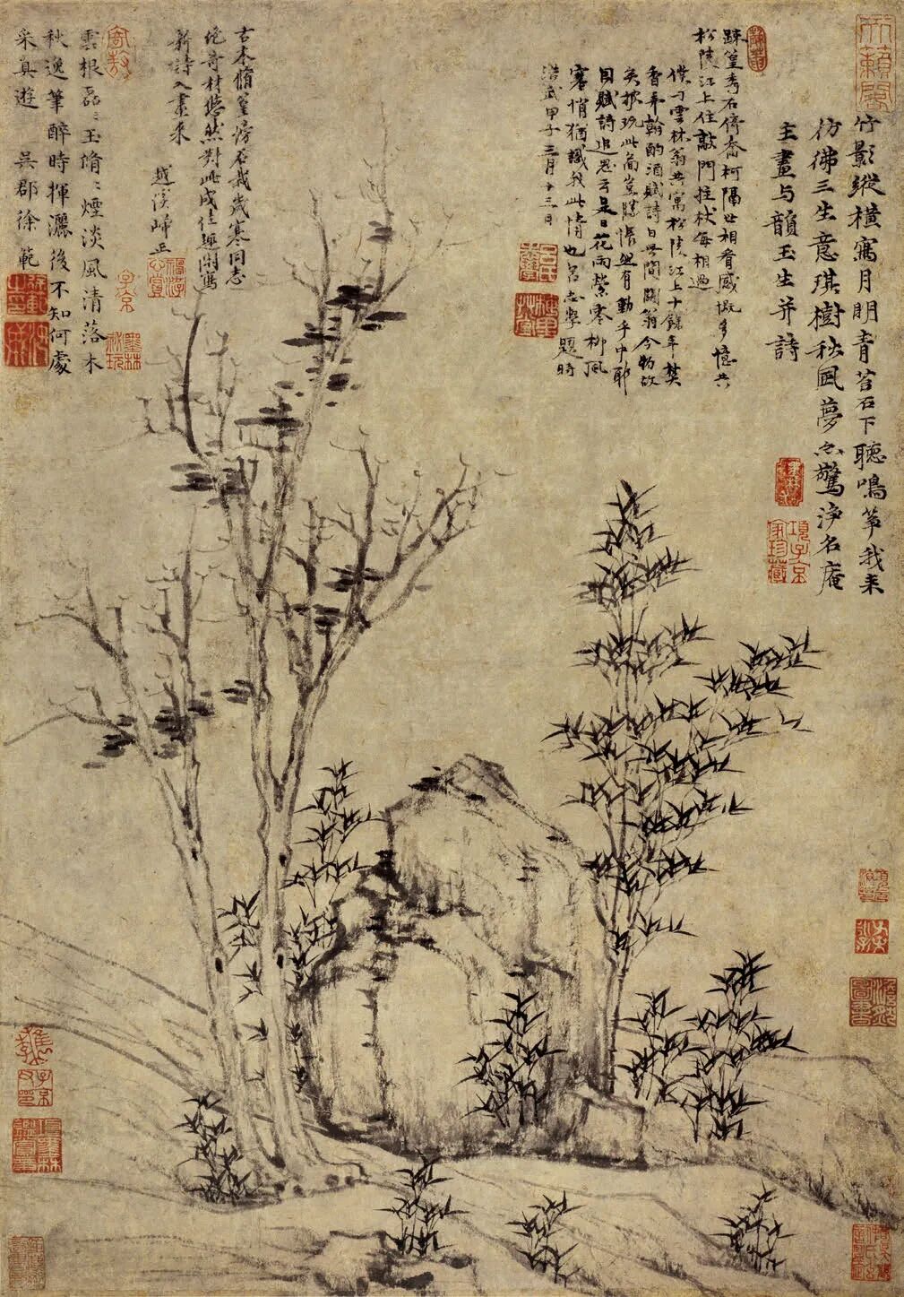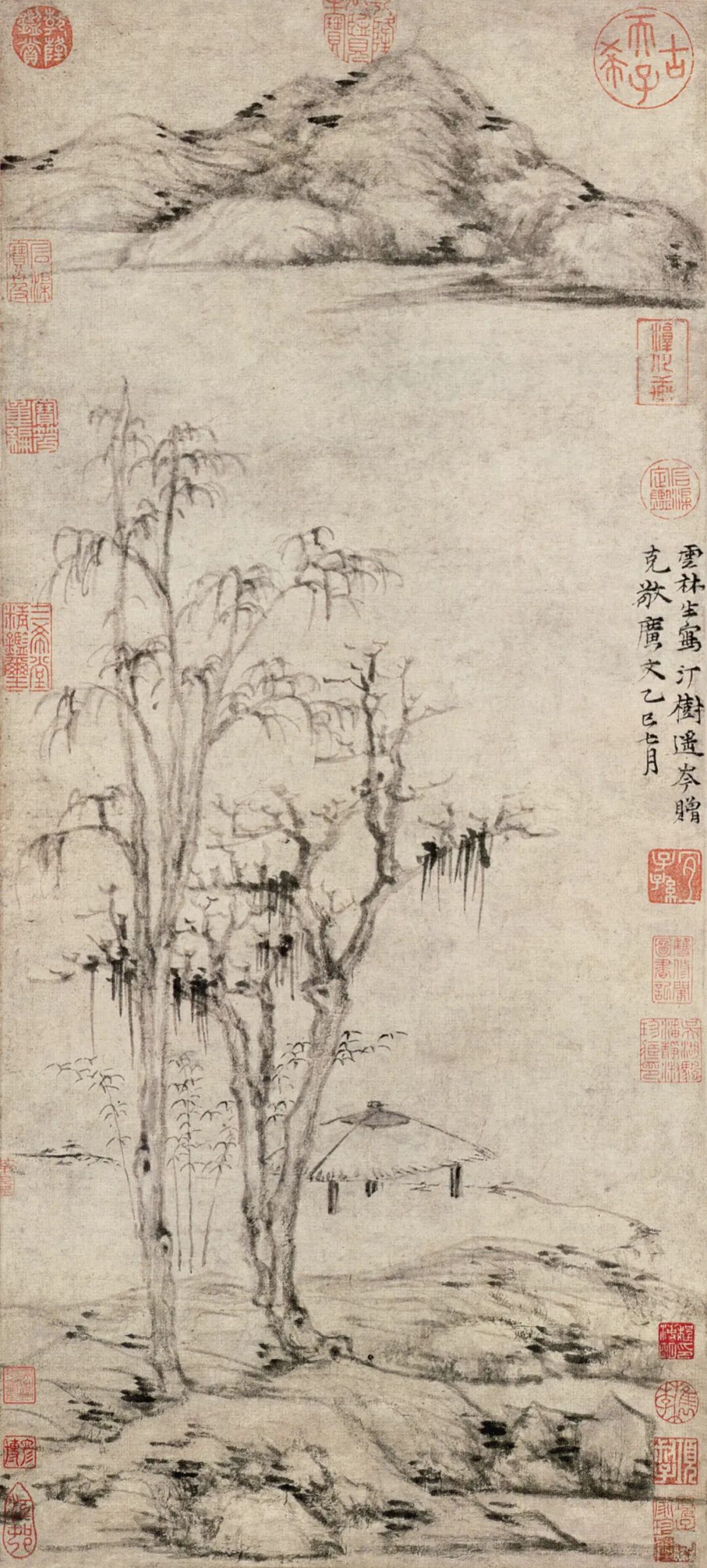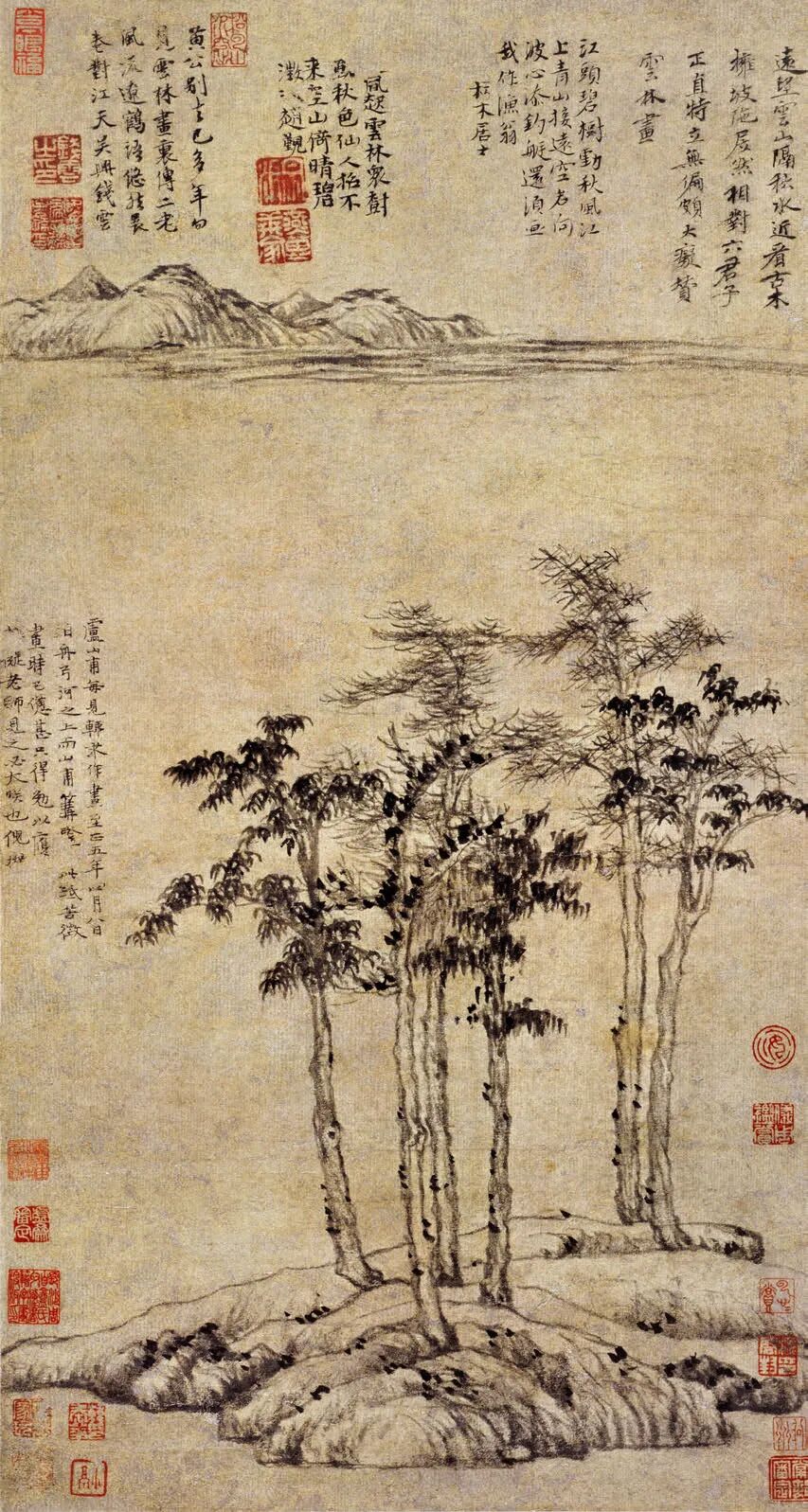 云林绘画的视觉形式难懂,但并没有影响后代艺术家、包括大量喜欢云林的普通读者去接近他的世界,这其中有一个重要原因,就是题跋的存在。文人画的视觉空间往往是诗、书、画、印的统合体,以云林为代表的元代艺术大家在这方面表现更为突出。就今天存世的云林真迹来说,一般都有自跋,不仅如此,云林还有一画多跋的习惯,在不同时间点见到自己的画,会作文字的记录。有时又对别人题跋再加跋文,说明因缘。云林的清閟阁,与顾阿瑛的玉山、曹知白的云西草堂,是当时著名的江南三大雅集之所,云林一生结交数以百计的朋友,常常与友人一起作诗作画。他的很多画作于与友人相会当顷或稍后,画中多有朋友题跋,包括当时文坛胜流(如虞集、柯九思、黄公望、王蒙、吴镇等)。诗、书、画、印的结合,留下深具意味的空间形式。自跋和他人题跋的叠合,记载着很多鲜活的场景,镌刻着他们对于艺术和人生的理解,这对于理解云林艺术作品本身带来了很大方便。