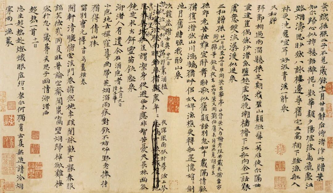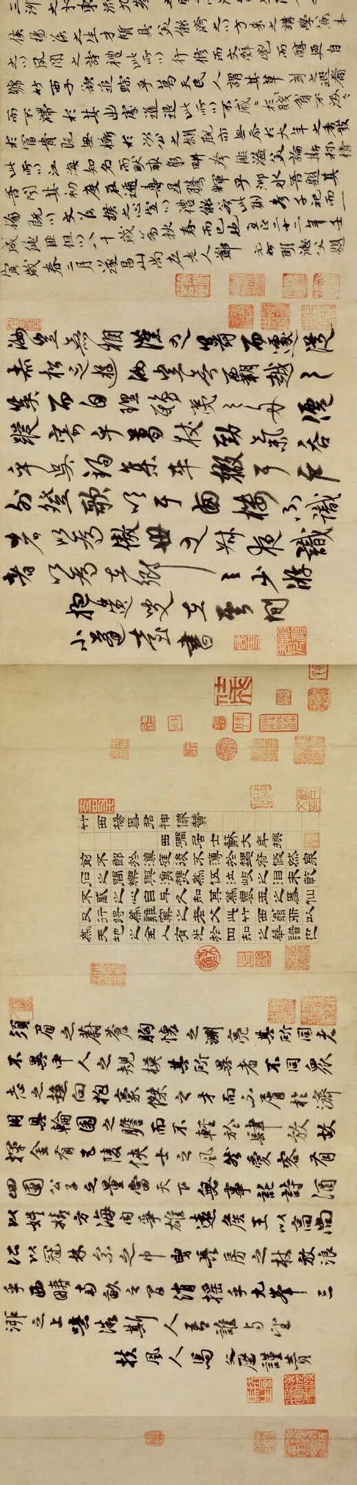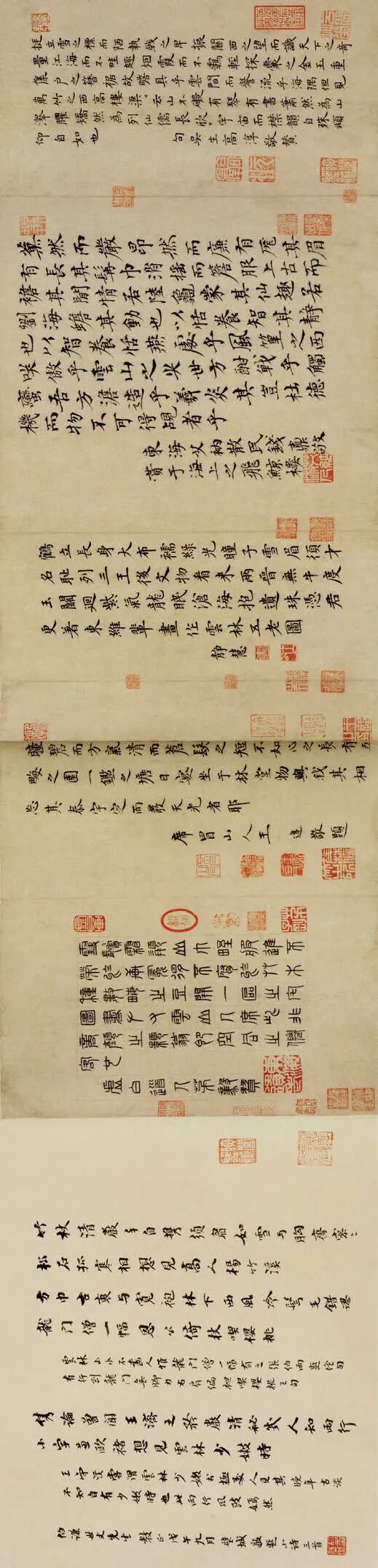 云林绘画的视觉形式难懂,但并没有影响后代艺术家、包括大量喜欢云林的普通读者去接近他的世界,这其中有一个重要原因,就是题跋的存在。文人画的视觉空间往往是诗、书、画、印的统合体,以云林为代表的元代艺术大家在这方面表现更为突出。就今天存世的云林真迹来说,一般都有自跋,不仅如此,云林还有一画多跋的习惯,在不同时间点见到自己的画,会作文字的记录。有时又对别人题跋再加跋文,说明因缘。云林的清閟阁,与顾阿瑛的玉山、曹知白的云西草堂,是当时著名的江南三大雅集之所,云林一生结交数以百计的朋友,常常与友人一起作诗作画。他的很多画作于与友人相会当顷或稍后,画中多有朋友题跋,包括当时文坛胜流(如虞集、柯九思、黄公望、王蒙、吴镇等)。诗、书、画、印的结合,留下深具意味的空间形式。自跋和他人题跋的叠合,记载着很多鲜活的场景,镌刻着他们对于艺术和人生的理解,这对于理解云林艺术作品本身带来了很大方便。