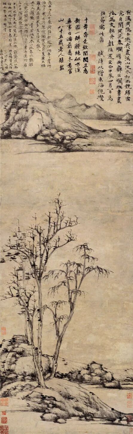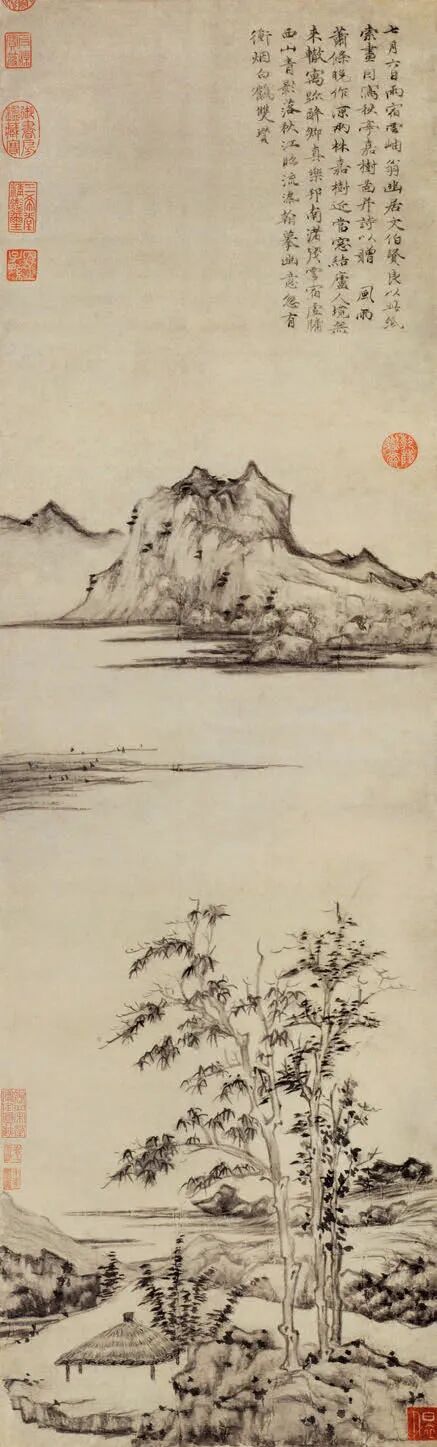 藏于上海博物馆的《渔庄秋霁图》,董其昌认为,为云林极品,[21]安岐认为,此画为云林“绝调”[22]。图作于一三五五年,一三七二年云林重题此图。画面中央近景处,焦墨画平峦上枯树五株(所谓孤桐只合在高岗),向空天中伸展,体势昂扬。中段空景,以示水体。向前乃是沙岸浦溆,以横皴画远山两重,约略黄昏之景。这当与他在太湖边生活的视觉经验有关,站在近岸,朝暮看太湖远山,就有这样的感觉。而这又非视觉经验的直接呈现。“悲歌何慨慷”(云林题此画语)—江城暮色中,风雨初歇,秋意已凉,正所谓袅袅兮秋风、洞庭波兮木叶下,云林于此画一种悲切,一种高旷,一种乾坤了望眼、幽意自彷徨的精神。意度主宰着画面空间的选择,不是由江岸视觉源点的远望所及,只是突出树、石等符号,略去种种(包括小舟、行人、暮色中的鸟),虚化种种(陂陀中的沙水,也非目击下存在之样态)。一切皆出于意度衡量之需要,需要在苍天中昂藏得法的高树,需要一痕山影的空茫,就尽意为之,而题诗中所说的“翠冉冉”“玉汪汪”等,一无踪迹。[23]画与王云浦的渔庄实景并无多大关系,系一种精神书写。