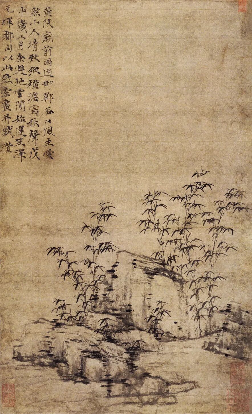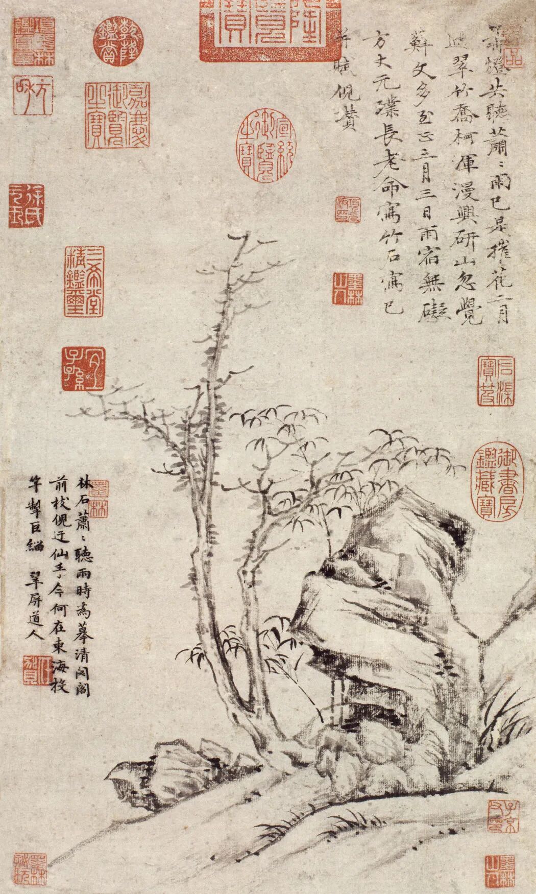 云林毕生喜画竹,传统竹画追求“此竹数尺耳,而有寻丈之势”,他却对“势”—运动感的追求并不热衷,却更愿意通过竹画来表达随处充满、无稍欠缺的精神。他喜画一枝竹,其《竹梢图》,没有繁复的形式,只是略其意趣。他自跋云:“此身已悟幻泡影,净性元如日月灯。”竹影飘忽,虚灵不昧,是他属意的世界。藏于“台北故宫博物院”的《春雨新篁图》,画一枝竹,上有多人题跋,其中叶著跋云:“先生清气逼人寒,爱写森森玉万竿,湖海归来已蝉蜕,一枝留得后人看。”云林一枝竹带给人独特的审美享受和思考。