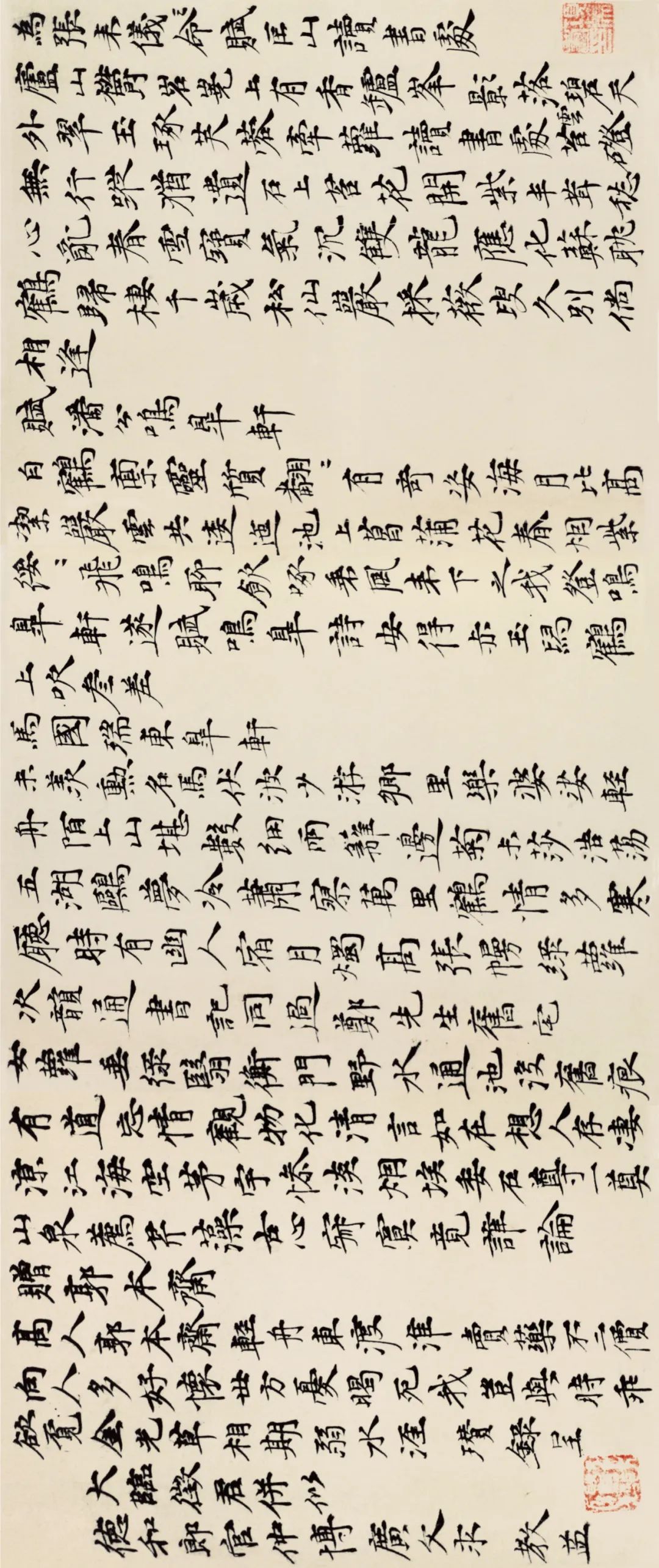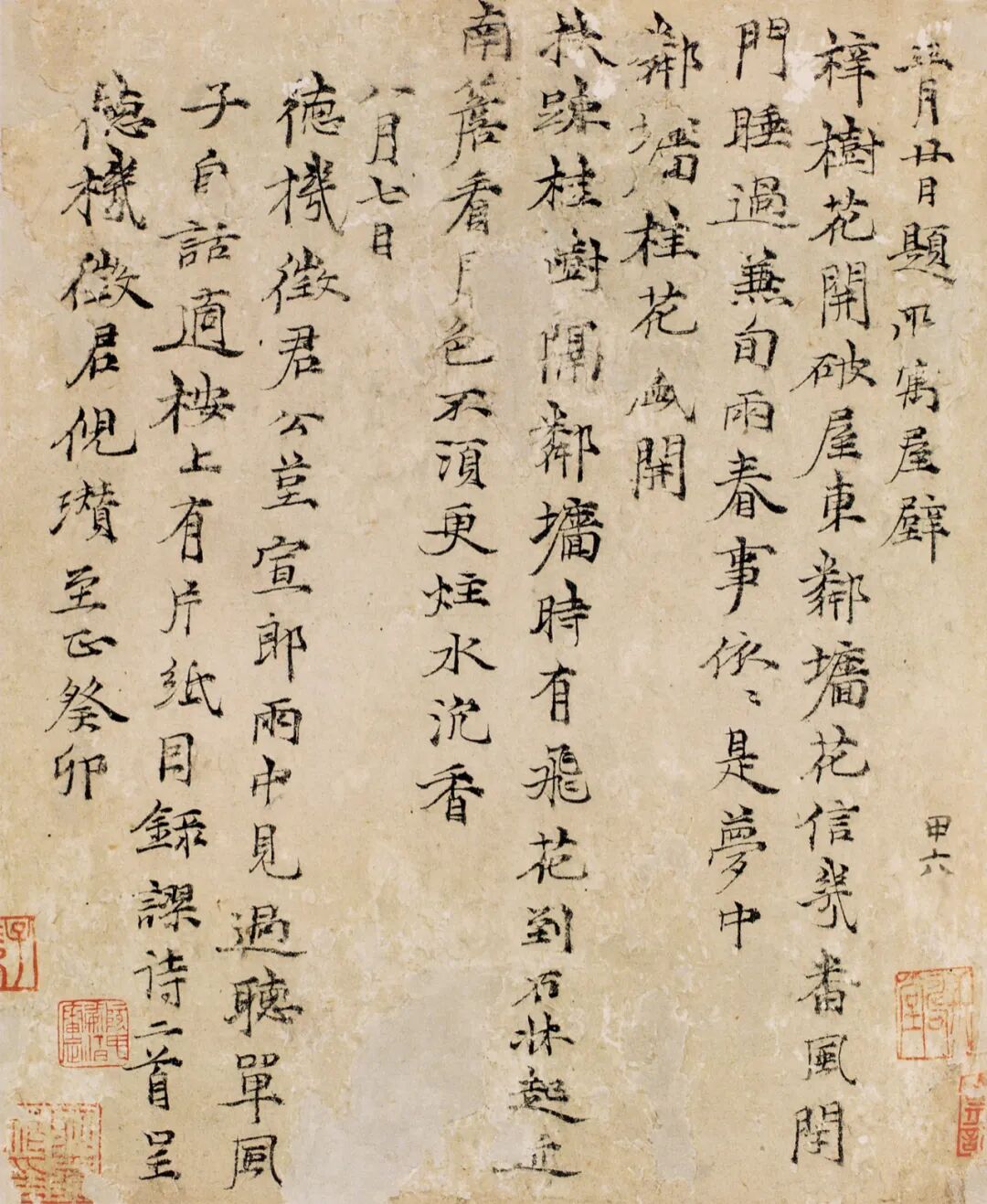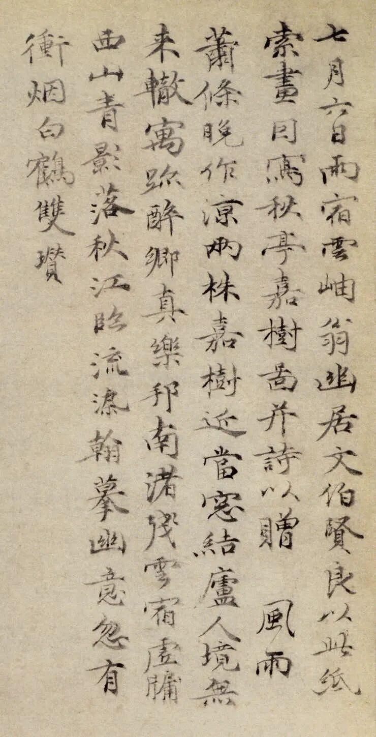[16]此作当为云林真迹。云林后人倪珵所辑《清閟阁遗稿》卷五(万历刻本)中收有此诗,诗题与此款同。李日华《味水轩日记》卷六也著录此画,竹懒翁曾见过此画。汪砢玉《珊瑚网》卷三十四、卞永誉《式古堂书画汇考》卷五十著录此作。此画曾经清内府所藏,康熙时曾归耿信公。