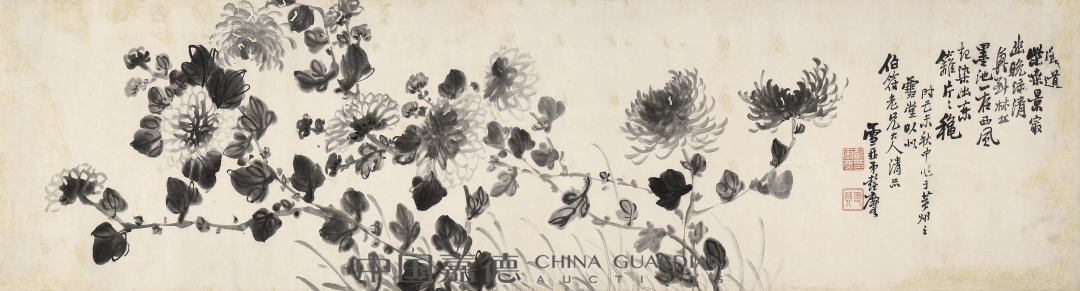 题识:闻道柴桑景最幽,晚凉清兴到林丘。墨池一夜西风起,染出东篱片片秋。时己未秋中,作于黄州之雪堂,以似伯符老兄大人清品。雪琴弟彭玉麐。