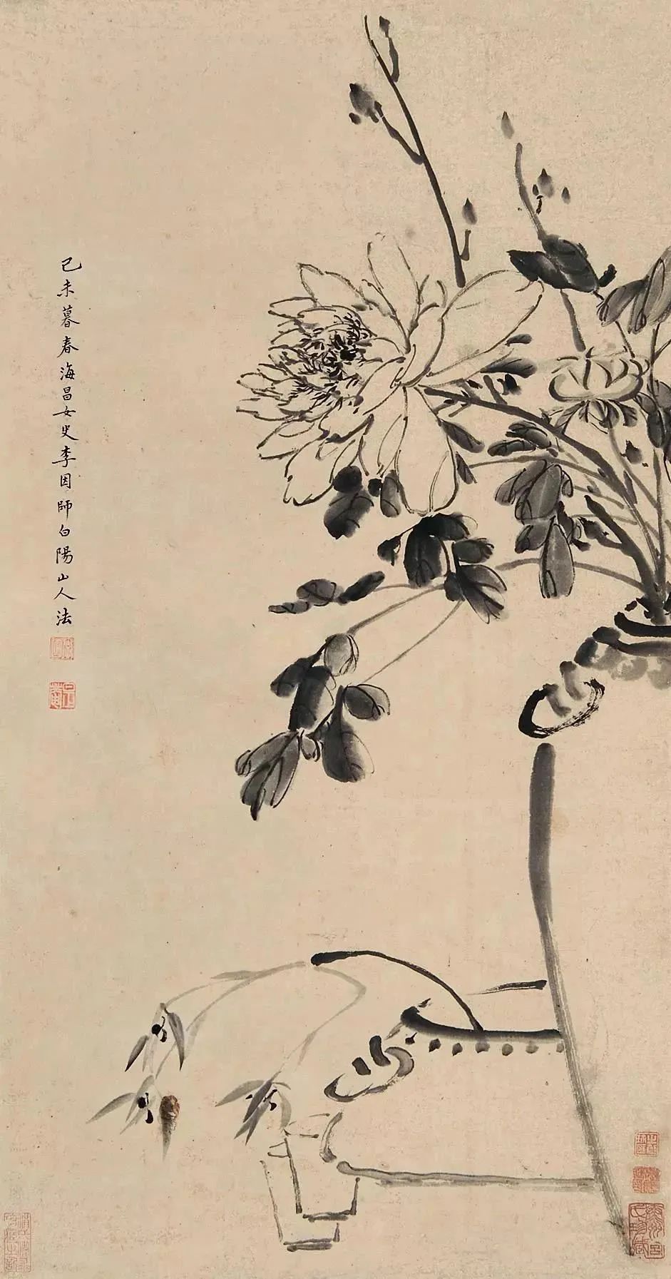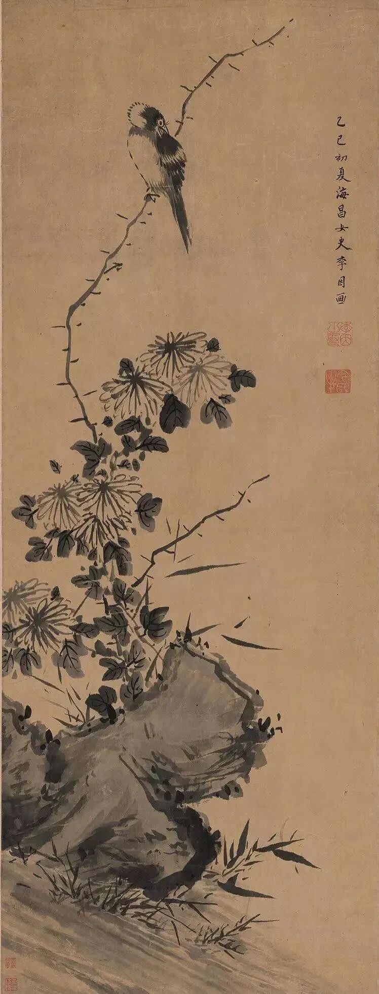 李因 菊石鸣禽图