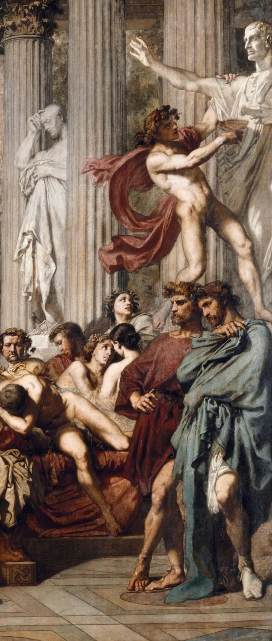 到了十九世纪,我们在西方绘画上大约已经找不到文艺复兴时期绘画里那种高雅细腻的公主或王子式握杯法了。比如,在法国学院派画家托马·库蒂尔(Thomas Couture,1815-1879)的代表作《罗马人的堕落》(1847)中,就为我们展示了古罗马的一场上流社会宴饮狂欢之后的余波。画面右边一个酩酊少年甚至爬上了雕像的基座,他握杯的方法就是不礼貌的“一把抓式”:![]()