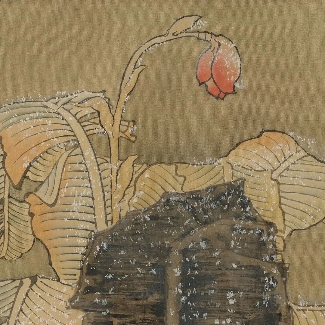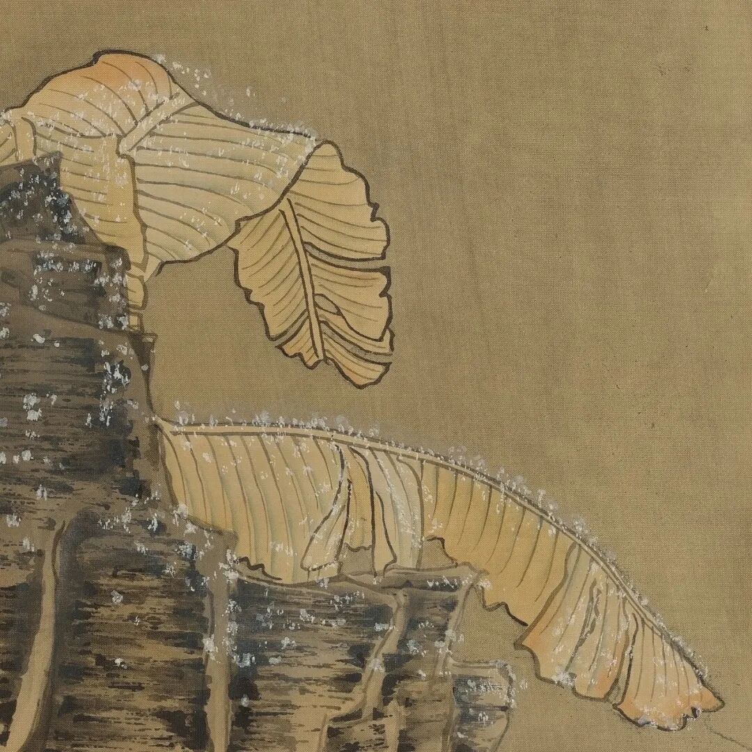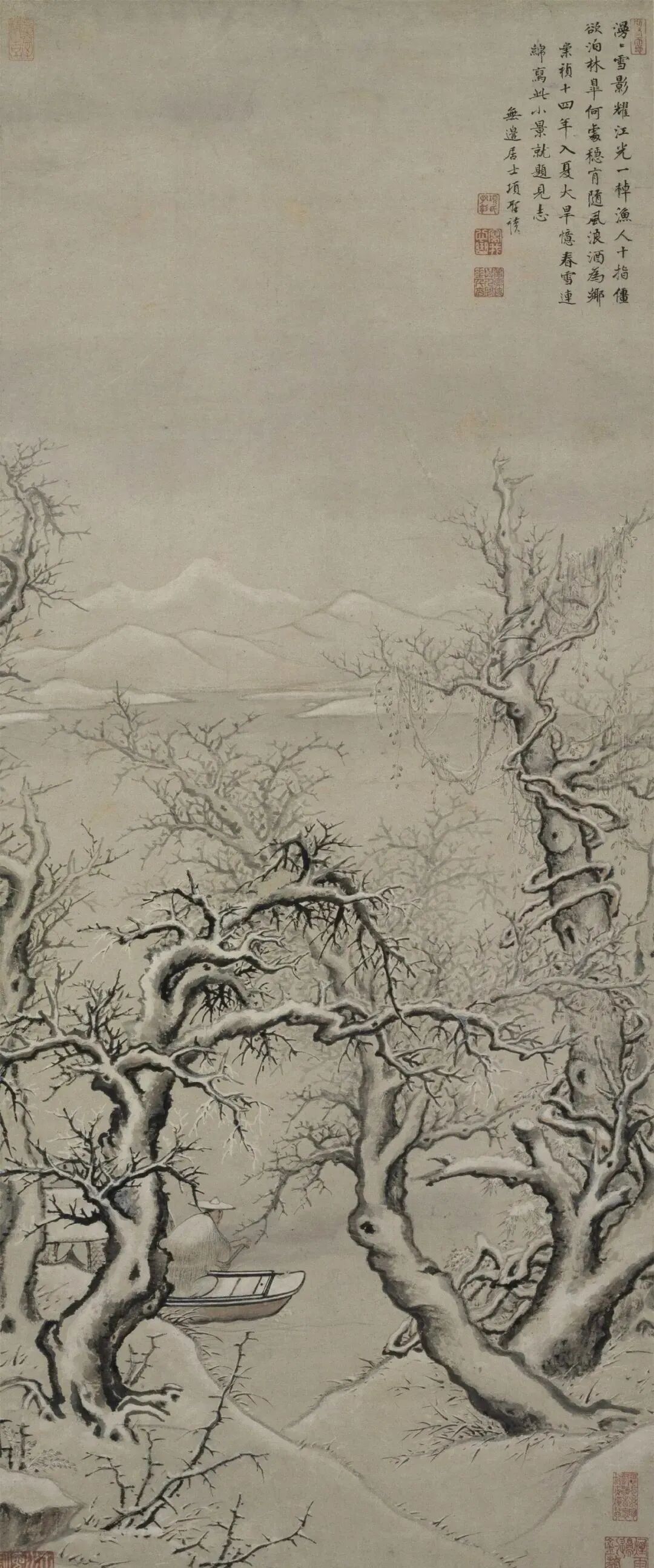 图中皑皑白雪覆盖下的四株老树粗壮挺拔,叉枒错落,树叶落尽,说明时当严冬。树下水边,一渔舟泊岸,渔夫身披簔衣,头戴斗笠,持桨立船头。远处云山一抹,一望无垠。画中自题:“漫漫雪影耀江光,一棹渔人十指僵。欲泊林臯何处稳,宜随风浪酒为乡。崇祯十四年入夏大旱,忆春雪连绵,写此小景就题见志。
