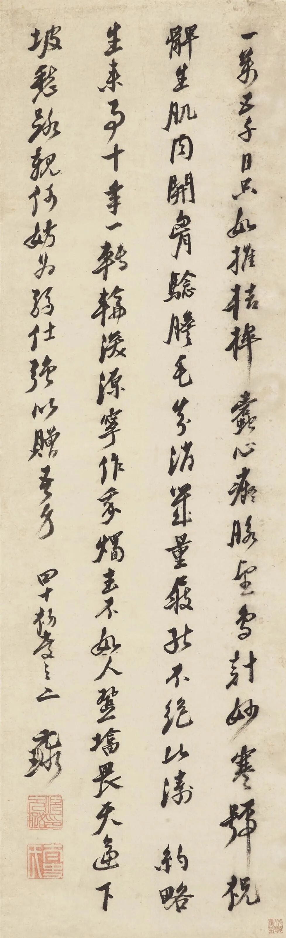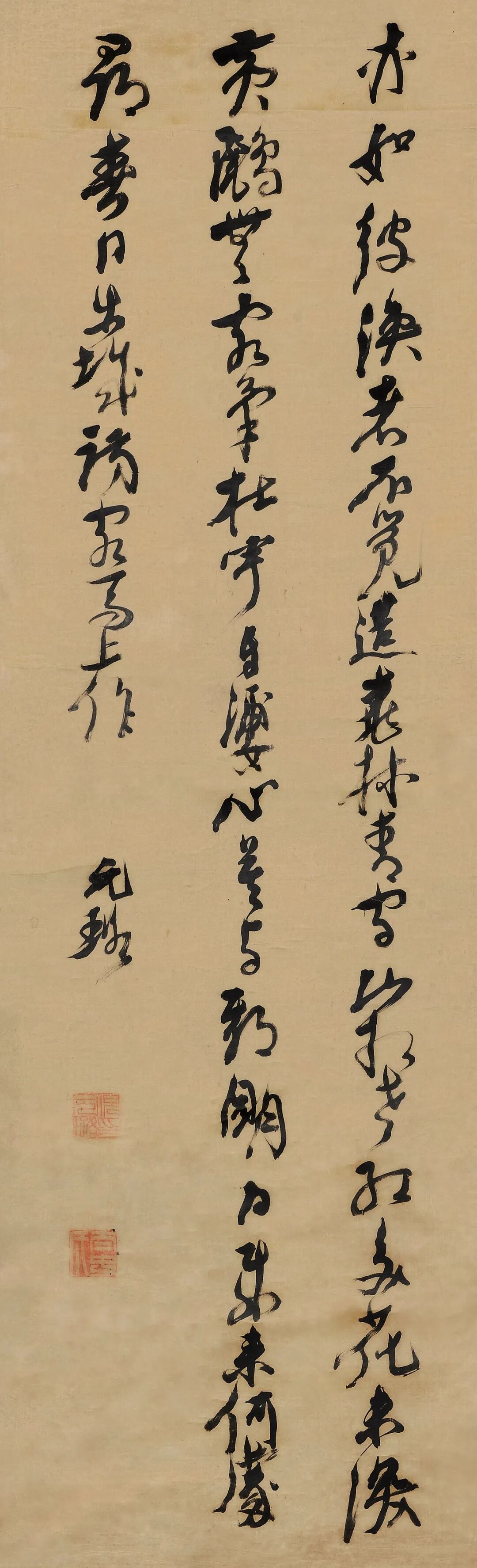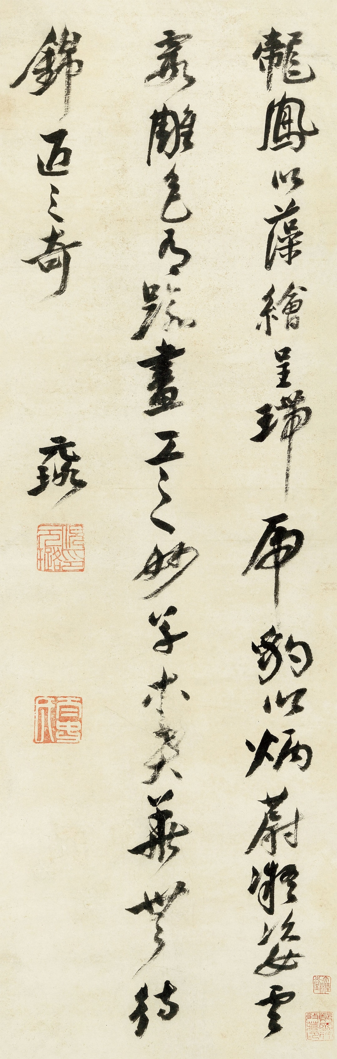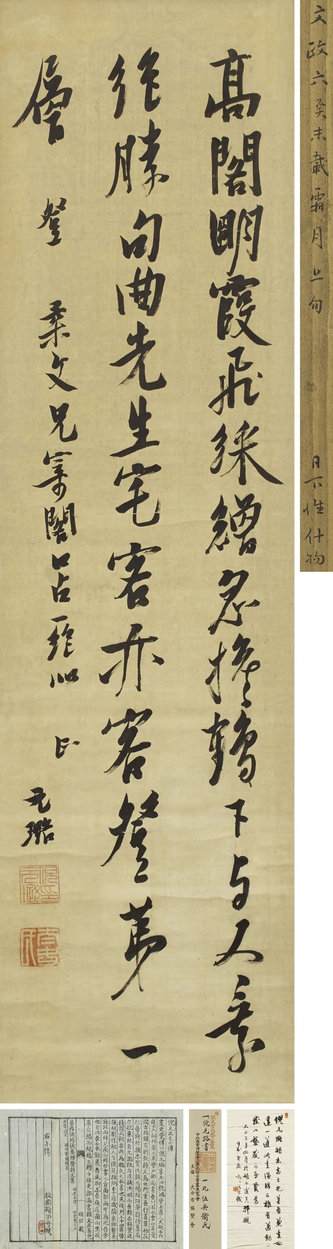 倪元璐(1593—1644)丨字汝玉,一作玉汝,号鸿宝,浙江上虞(今绍兴市上虞区)人,明末官员、书法家。明天启二年(1622)进士,历官至户、礼两部尚书,书、画俱工。能诗文,善行草,工画山水竹石,有《倪文贞集》、《倪易内外仪》。行书《四十初度诗》 立轴 水墨纸本125.5×38.5cm释文:一万五千日,只如推桔槔。蠹心痴脉望,鸟计妙寒号。祝髀生肌肉,开胸验胆毛。芬消几量屐,能不绝山涛。约略生来事,十年一转轮。深源宁作我,烛武不如人。跫塔畏天逼,下坡愁路亲。何妨为弱仕,强以赠吾身。倪元璐节录世说新语 立轴 水墨绫本130×44cm款识:殷中军道韩太常曰:康伯少自标置,居然是出群,及其发言遣辞,往往有情致。似,舒章世丈。元璐。倪元璐以学问气节名闻当世与青史,其书法一如其人,倔强峬峭,风骨凛然,迥不犹人。他作书中宫紧收,字距亦密,而行距总极宽,有危岩断石,落地铿锵之感。此轴即是,虽只三行,而精神气格熠熠动人,仰面令人生敬。倪元璐行书五言诗 立轴 水墨绢本189×47.5cm释文:但望云虹气,吾旗即已降。一浮锄水宅,共倚叫山堂。蒋径无多地,潘才洵若江。何须求月上,君面有银缸。观倪元璐作品,大多彰显出老拙之意态,表现出稚拙之趣。由于晚明尊碑意识产生,对倪元璐书风的形成有着巨大的影响,致使倪元璐对二王帖学的传统模式由亲和到冷落再到反叛。同时,也使明代书法从优美走到了壮美。倪元璐草书《春日出城访客》 立轴 水墨绫本164×51cm倪元璐草书节录《文心雕龙》 立轴 纸本112.5×35cm释文:龙凤以藻绘呈瑞,虎豹以炳蔚凝姿。云霞雕色,有逾画工之妙。草木贲华,无待锦匠之奇。