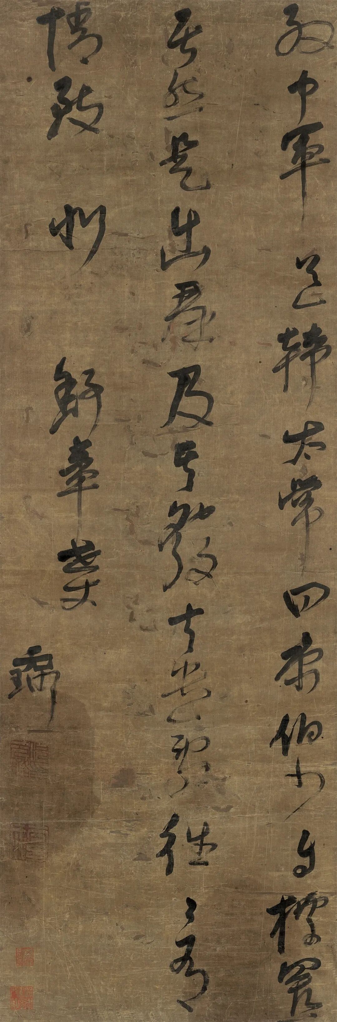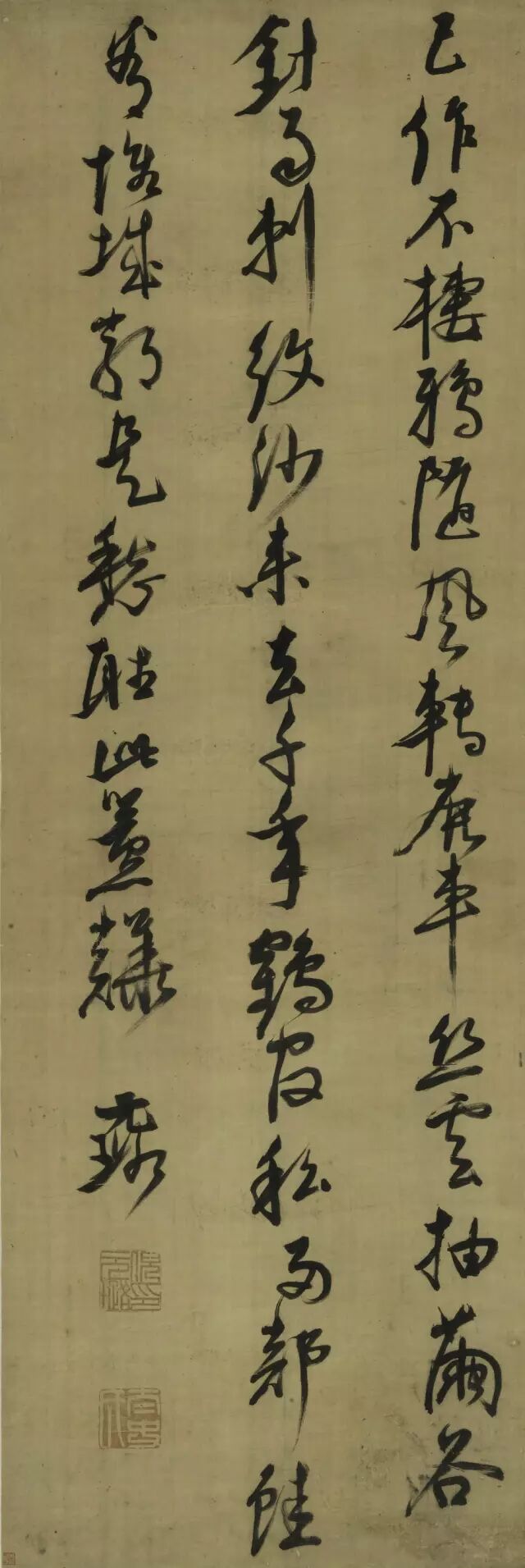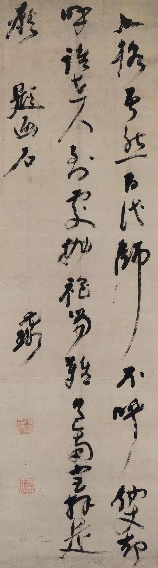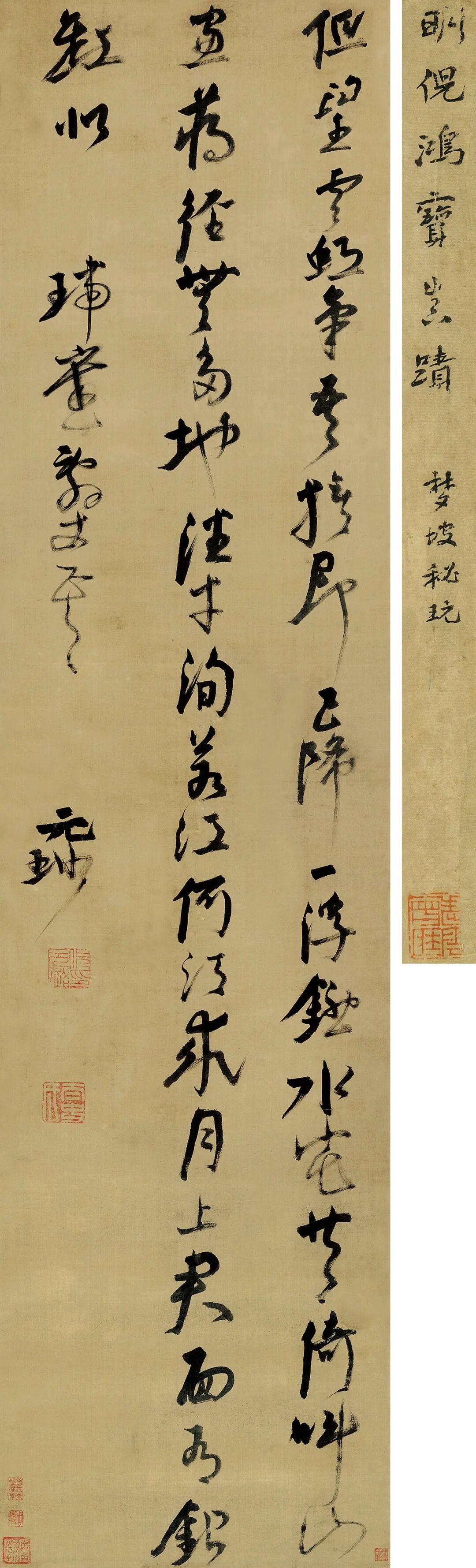 倪元璐(1593—1644)丨字汝玉,一作玉汝,号鸿宝,浙江上虞(今绍兴市上虞区)人,明末官员、书法家。明天启二年(1622)进士,历官至户、礼两部尚书,书、画俱工。能诗文,善行草,工画山水竹石,有《倪文贞集》、《倪易内外仪》。行书《四十初度诗》 立轴 水墨纸本125.5×38.5cm释文:一万五千日,只如推桔槔。蠹心痴脉望,鸟计妙寒号。祝髀生肌肉,开胸验胆毛。芬消几量屐,能不绝山涛。约略生来事,十年一转轮。深源宁作我,烛武不如人。跫塔畏天逼,下坡愁路亲。何妨为弱仕,强以赠吾身。倪元璐节录世说新语 立轴 水墨绫本130×44cm款识:殷中军道韩太常曰:康伯少自标置,居然是出群,及其发言遣辞,往往有情致。似,舒章世丈。元璐。倪元璐以学问气节名闻当世与青史,其书法一如其人,倔强峬峭,风骨凛然,迥不犹人。他作书中宫紧收,字距亦密,而行距总极宽,有危岩断石,落地铿锵之感。此轴即是,虽只三行,而精神气格熠熠动人,仰面令人生敬。倪元璐行书五言诗 立轴 水墨绢本189×47.5cm释文:但望云虹气,吾旗即已降。一浮锄水宅,共倚叫山堂。蒋径无多地,潘才洵若江。何须求月上,君面有银缸。观倪元璐作品,大多彰显出老拙之意态,表现出稚拙之趣。由于晚明尊碑意识产生,对倪元璐书风的形成有着巨大的影响,致使倪元璐对二王帖学的传统模式由亲和到冷落再到反叛。同时,也使明代书法从优美走到了壮美。倪元璐草书《春日出城访客》 立轴 水墨绫本164×51cm倪元璐草书节录《文心雕龙》 立轴 纸本112.5×35cm释文:龙凤以藻绘呈瑞,虎豹以炳蔚凝姿。云霞雕色,有逾画工之妙。草木贲华,无待锦匠之奇。