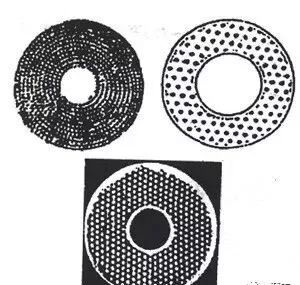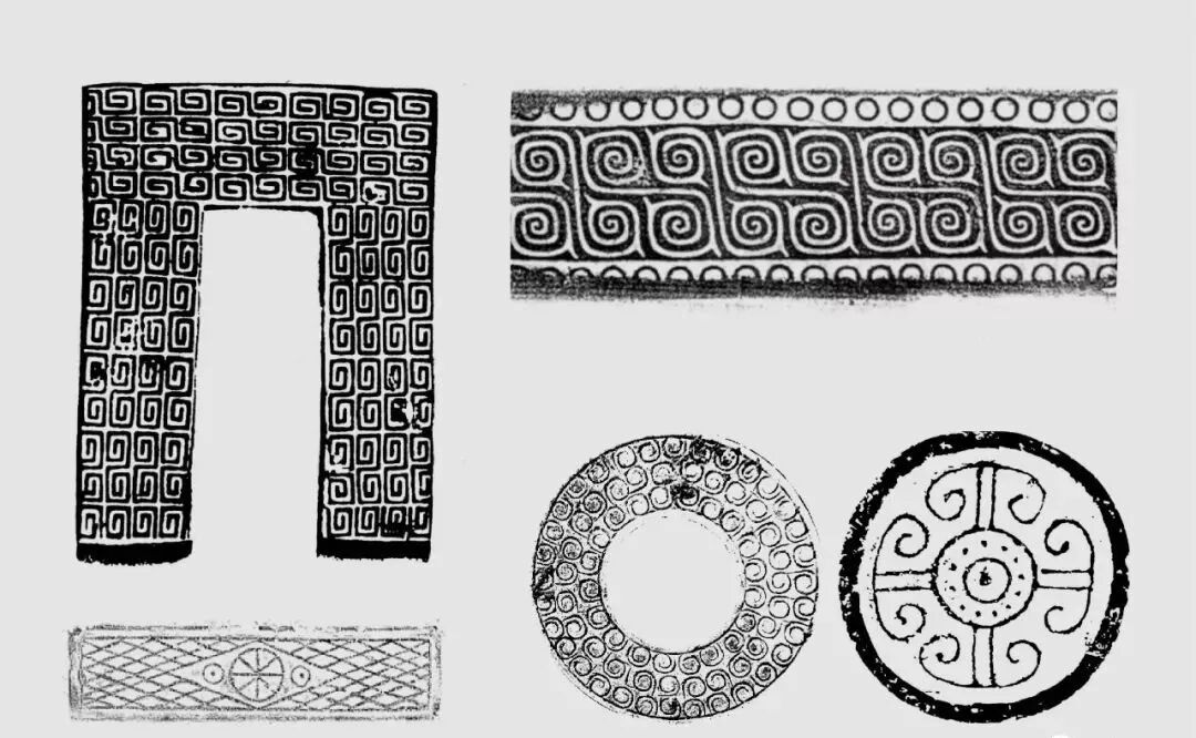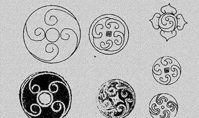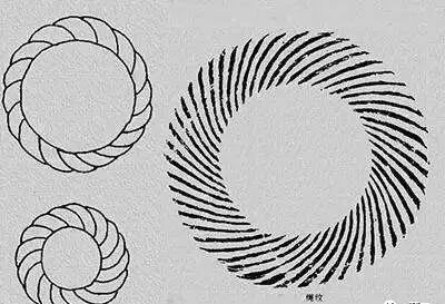 其特征是圆形,内圈沿边饰有旋转状弧线,中间为一小圆圈,似代表水隆起状,圆形旁边有五条半圆形的曲线,似水涡激起状。
