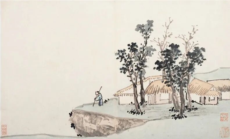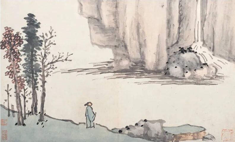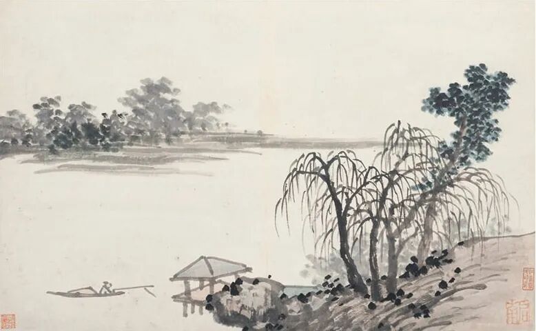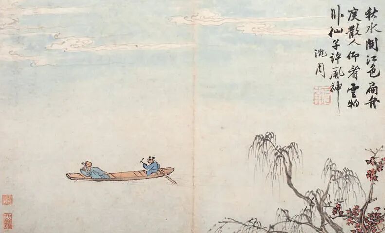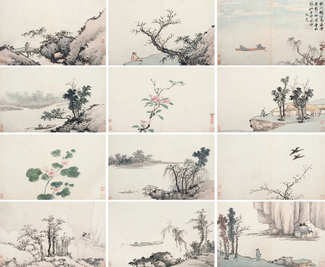 此《随兴册页》是沈周消遣时日的戏笔之作。共计十二开,花鸟三开,有杏花、枯木双鸦、芙蓉。山水九开,有秋江望云、独坐、望崖、过桥、独钓、观瀑、雪旅;画中花卉以没骨晕染,设色清雅。山水林木用笔简劲苍润,多用淡墨皴擦渲染,有的亦注重用浓墨提醒,属于典型的沈周晚年的绘画风格。花鸟册页作杏花、芙蓉、双鸦,杏花象征着春意和朝气,仿佛在追忆逝去的年华,芙蓉象征的是清雅和富贵,寓意美好,而枯木双鸦则凸显了秋日的萧瑟、苍凉之意境。山水册页表现的是画家平时幽闲清雅的生活,秋江望云,独坐幽谷、望崖观瀑,山亭独钓.......萧瑟爽朗的秋景下,仰卧漂浮的扁舟之上,感悟人生之变幻沉浮,画家高雅闲散之生活状态,寥寥数笔即跃然纸上。