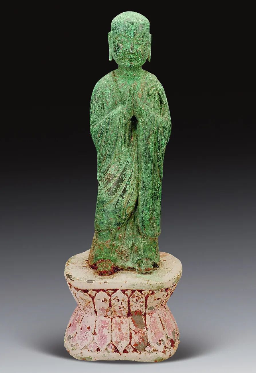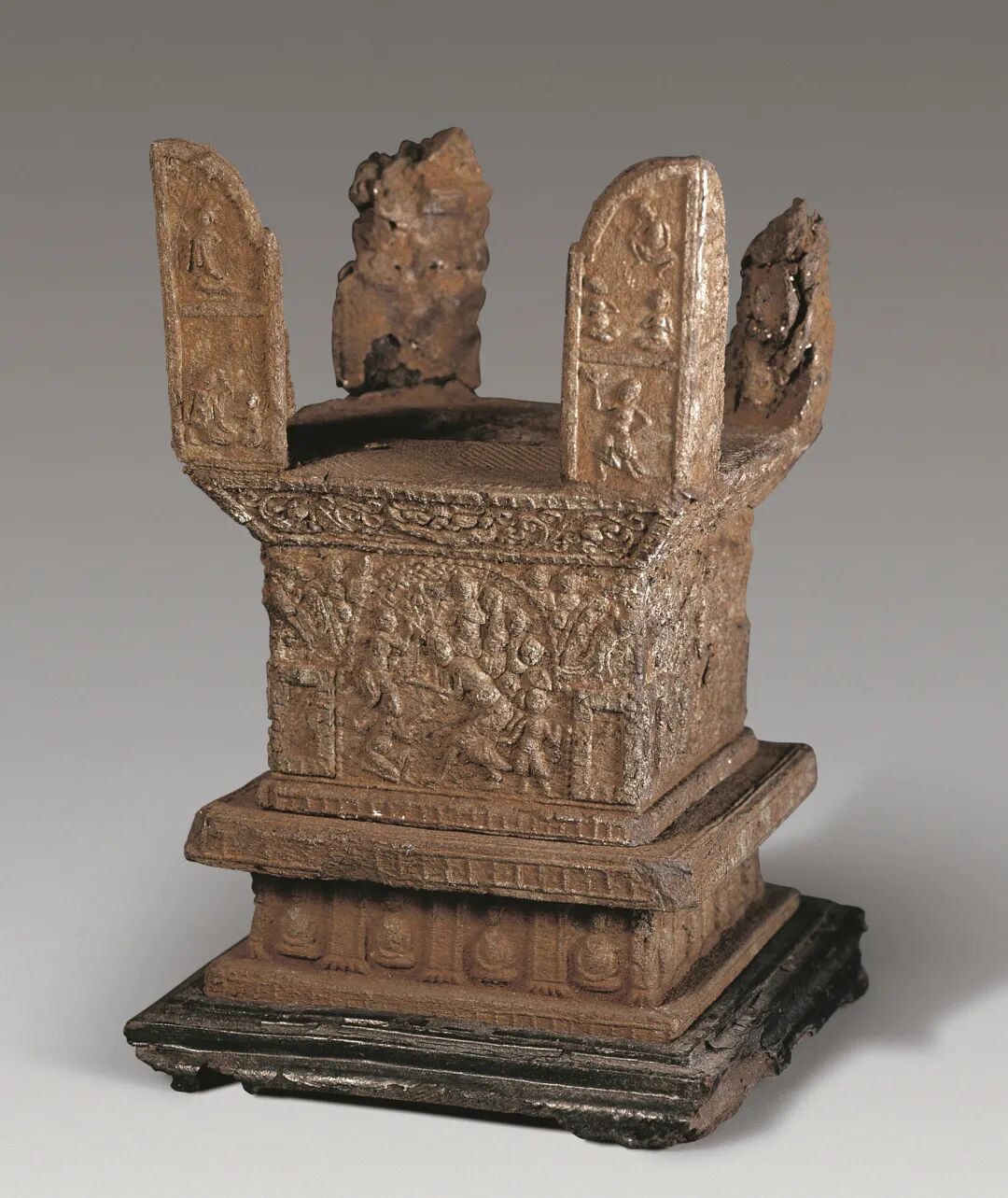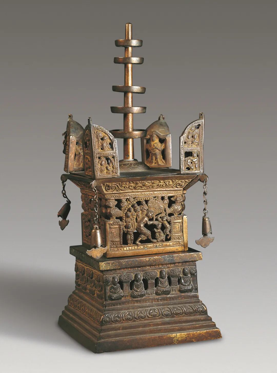 吴越国时期民间铸造的阿育王塔多为铜质,基座、塔身、山花蕉叶、塔刹、相轮分铸后插合而成,目前发现10座。所见最早者为黄岩灵石寺塔天宫所出,残存铜须弥座,其侧壁用三棵菩提树间隔四尊禅定坐佛,座面环刻一圈铭文:“陈八娘为亡妣林十娘子女弟子造塔一所永充供养乾祐三年(950)二月十八日记”,铸造时间早于钱(弘)俶乙卯岁(955)铜阿育王塔。此塔虽缺失塔身、山花蕉叶、塔刹,其底座的形制与萧山祇园寺石塔出土的“戊午显德五年(958)”铜塔须弥座相同。苏州瑞光寺塔出土的“岁次乙卯”铜塔,其山花蕉叶上已铸出连环画式佛传故事画面。