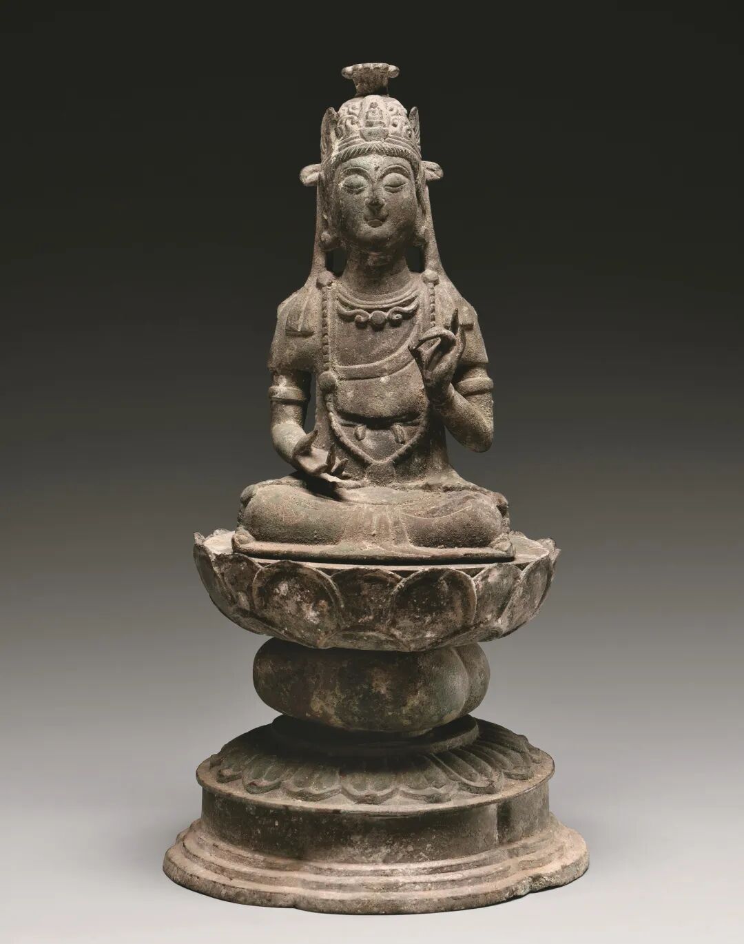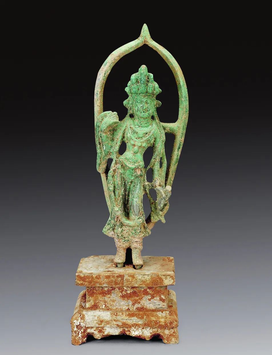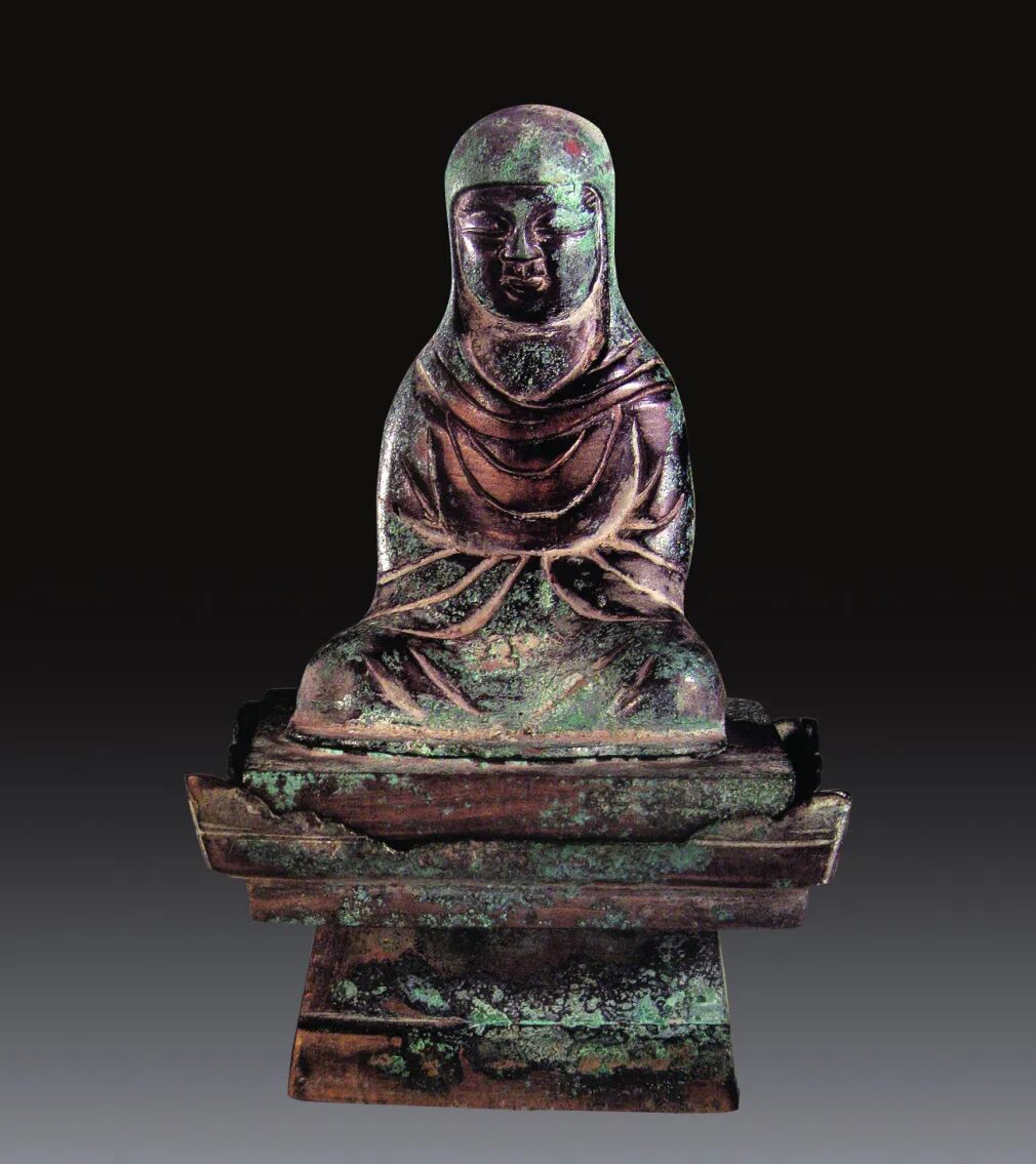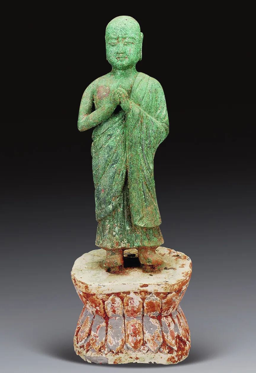 吴越国时期民间铸造的阿育王塔多为铜质,基座、塔身、山花蕉叶、塔刹、相轮分铸后插合而成,目前发现10座。所见最早者为黄岩灵石寺塔天宫所出,残存铜须弥座,其侧壁用三棵菩提树间隔四尊禅定坐佛,座面环刻一圈铭文:“陈八娘为亡妣林十娘子女弟子造塔一所永充供养乾祐三年(950)二月十八日记”,铸造时间早于钱(弘)俶乙卯岁(955)铜阿育王塔。此塔虽缺失塔身、山花蕉叶、塔刹,其底座的形制与萧山祇园寺石塔出土的“戊午显德五年(958)”铜塔须弥座相同。苏州瑞光寺塔出土的“岁次乙卯”铜塔,其山花蕉叶上已铸出连环画式佛传故事画面。