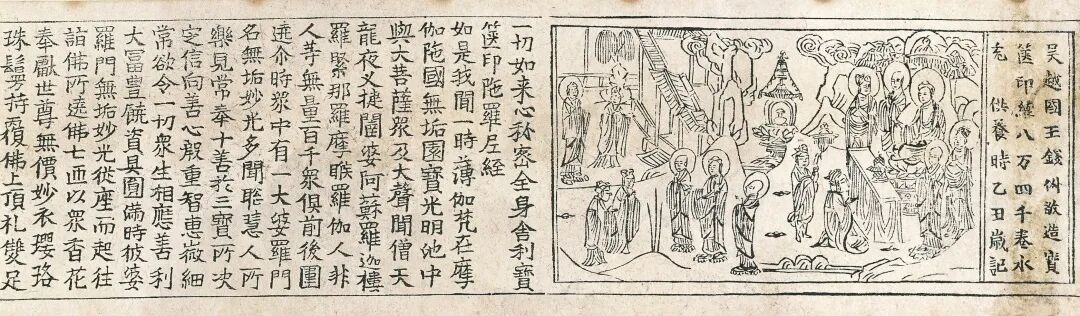 南宋志磐《佛祖统纪》记载:“吴越王钱俶,天性敬佛,慕阿育王造塔之事,用金铜精钢造八万四千塔。中藏《宝箧印心咒经》,布散部内,凡十年而讫功。”考古发现与文献记载互证。钱(弘)俶仿效阿育王造塔之举,用铜、铁各铸八万四千阿育王塔,瘗藏刻本《宝箧印经》。从塔上铸铭可知,钱(弘)俶相隔十年,两次各铸八万四千阿育王塔:周世宗毁佛之显德二年乙卯岁(955)造八万四千铜塔,内壁铸出“吴越国王钱弘俶敬造八万四千宝塔乙卯岁记”,用来安放翌年印制的佛经;宋太祖乾德三年乙丑岁(965)再造八万四千铁塔,底板上铸有“吴越国王俶敬造宝塔八万四千所永充供养时乙丑岁记”,并装有同年刻印的佛经。