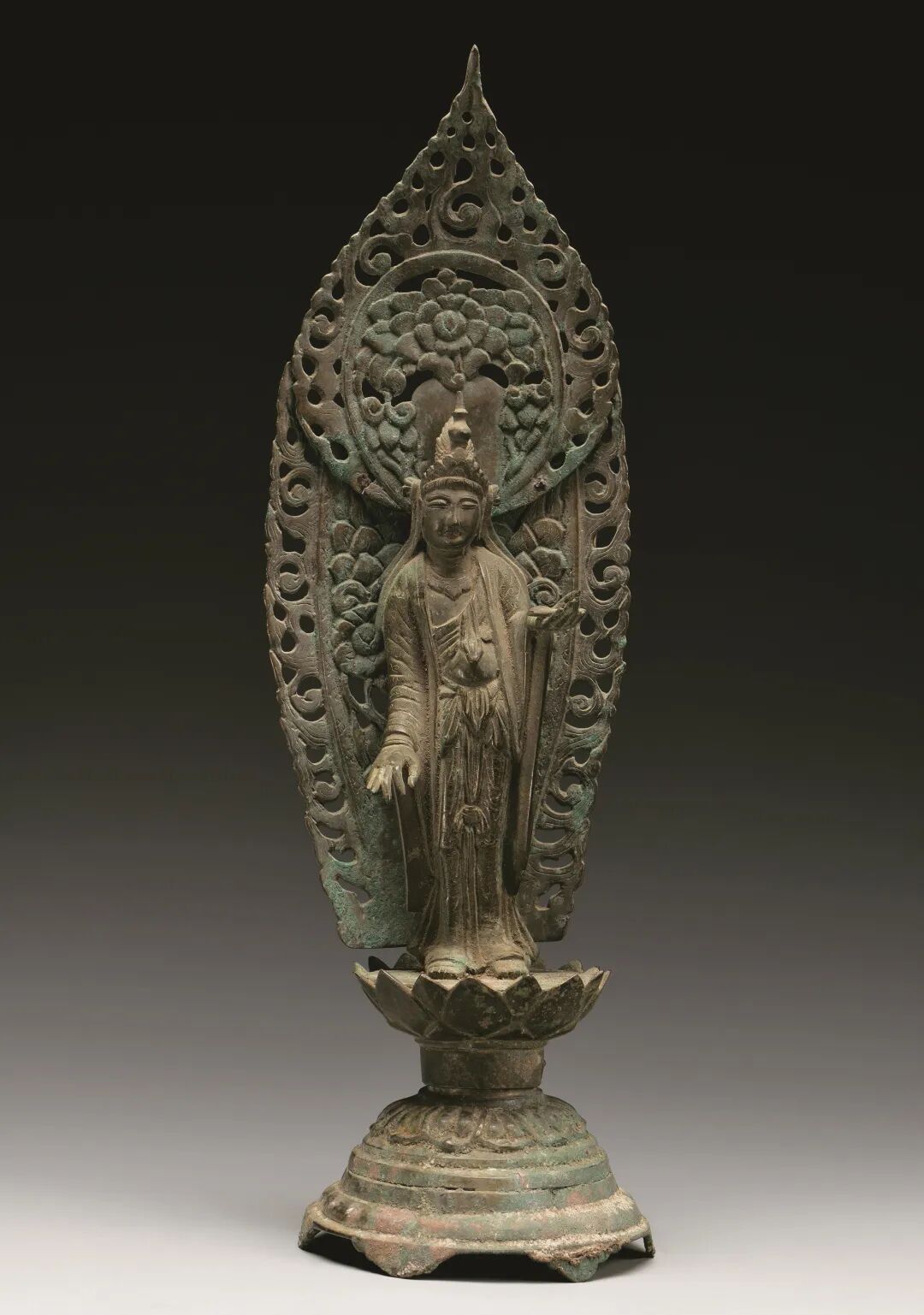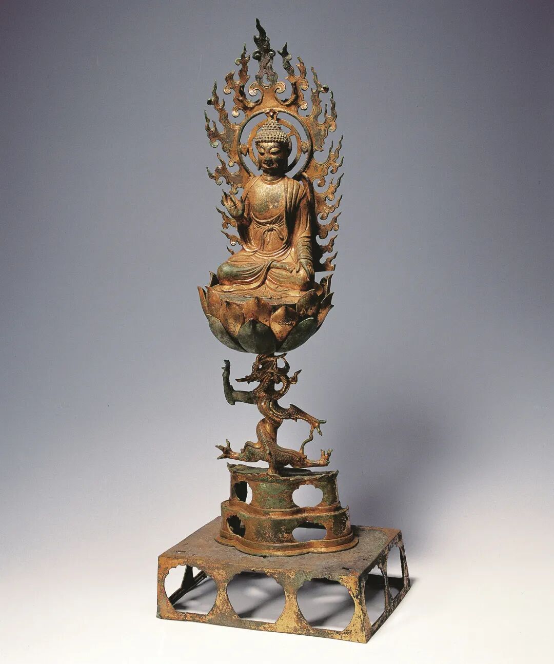 阿育王塔实物,方形中空,外形作单层束腰状,自下而上由基座、塔身、塔顶三部分组成。塔顶四角耸立山花蕉叶,正中竖塔刹。铜、铁阿育王塔的铸造方式和山花蕉叶图案不同,每座铜塔铸有千字文编号。塔身四面的佛本生画面,铜塔作浮雕式,铁塔为透雕式,与日本真人元开《唐大和上东征传》中所记“一面萨埵王子变,一面舍眼变,一面出脑变,一面救鸽变”相符,意在宣说释迦牟尼生前的善行故事。铜阿育王塔在山花蕉叶上铸出站立持械的力士,铁阿育王塔的山花蕉叶上铸出“胁下降生”“步步生莲”“二龙灌浴”“比武掷象”“削发出家”“连河洗污”“牧女献糜”“初转法轮”等佛传故事画面。塔身四角有护卫佛法的“天龙八部”之一——金翅鸟,梵名“迦楼罗”。