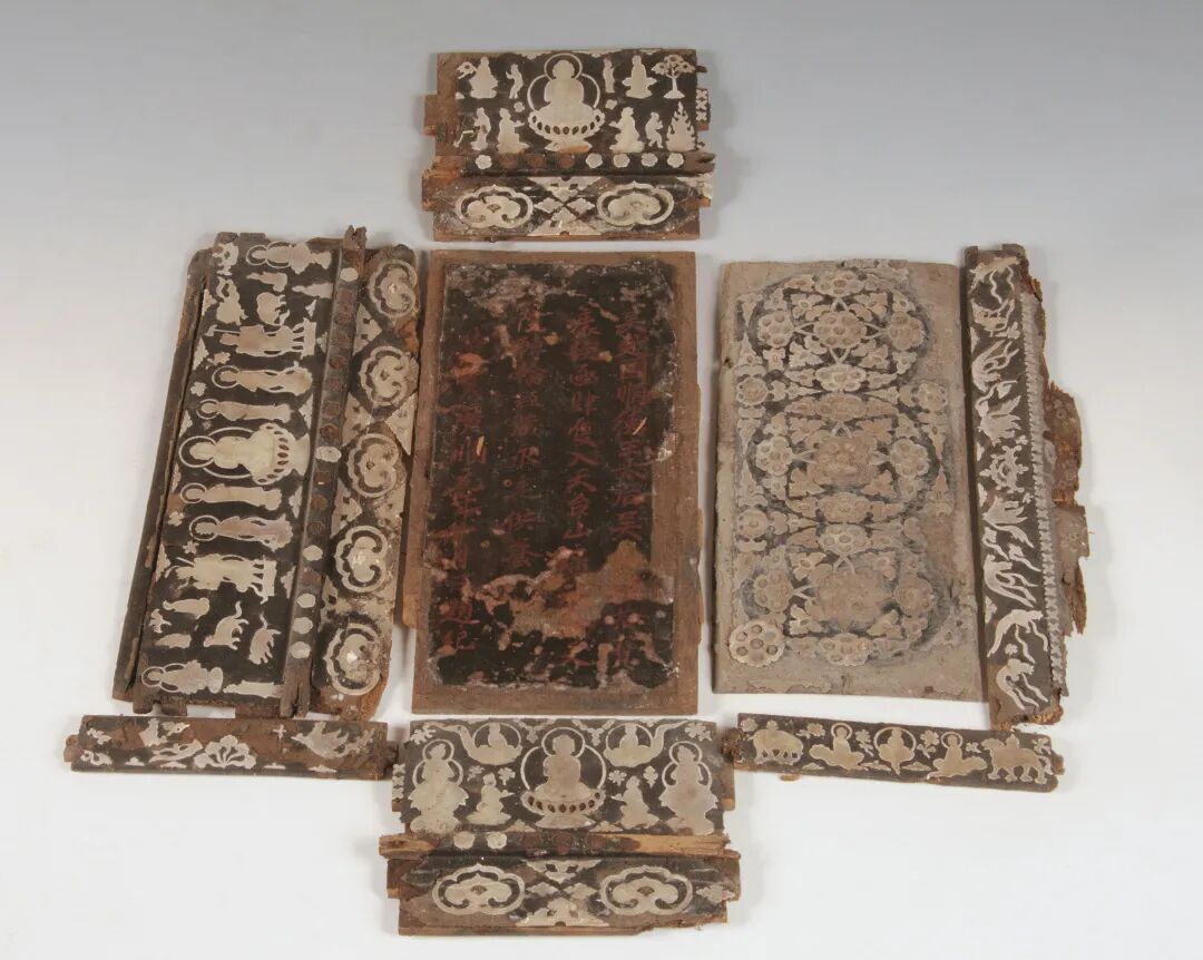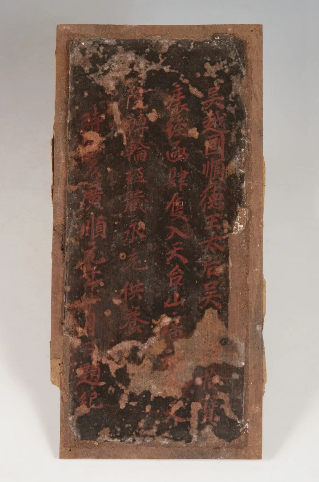 湖州飞英塔发现的后周广顺元年(951)钱(弘)俶生母吴汉月舍入天台山的镶嵌螺钿漆函,函内装藏刻本经折装《妙法莲华经》,外底朱书四行题记:“吴越国顺德王太后吴氏谨拾(舍)宝装经函四只入天台山广福金文院转轮经藏永充供养时辛亥广顺元年十月日题纪”。