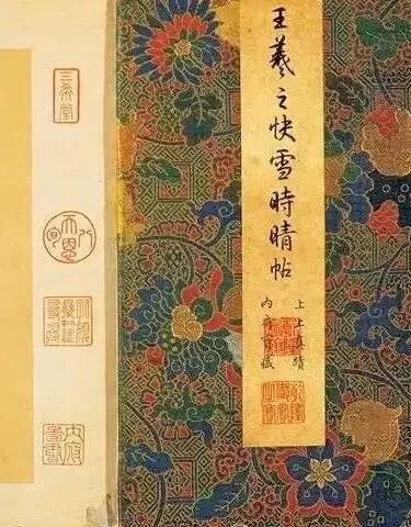 乾隆对三希堂内收藏的书画及工艺珍品十分上心,在装裱时甚至会亲自建造,参与设计。《快雪时晴帖》所用包首自然也相当考究,是一块有牡丹、莲蓬、桃子、佛手、石榴、云纹等图案的繁复织锦。