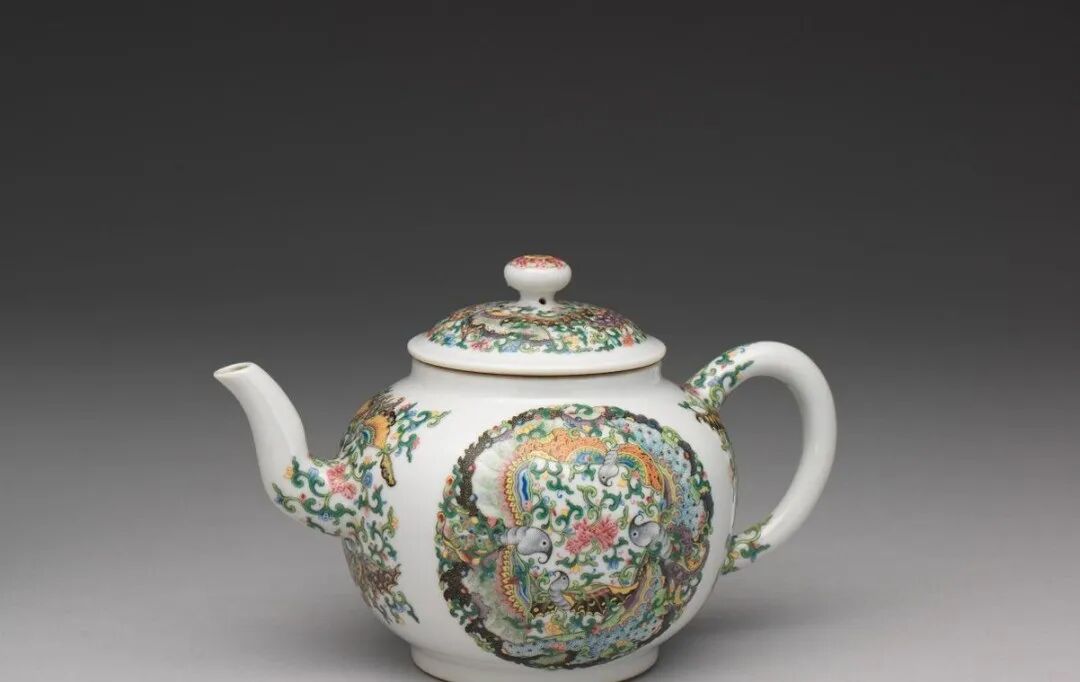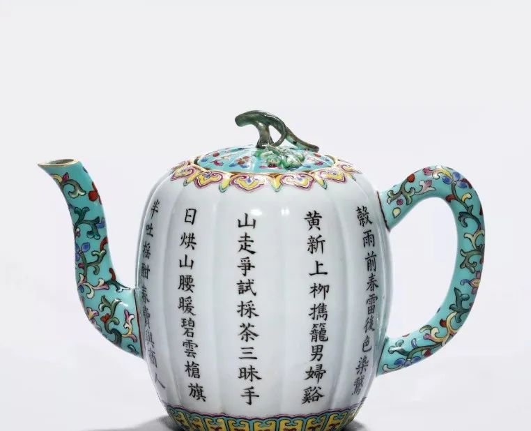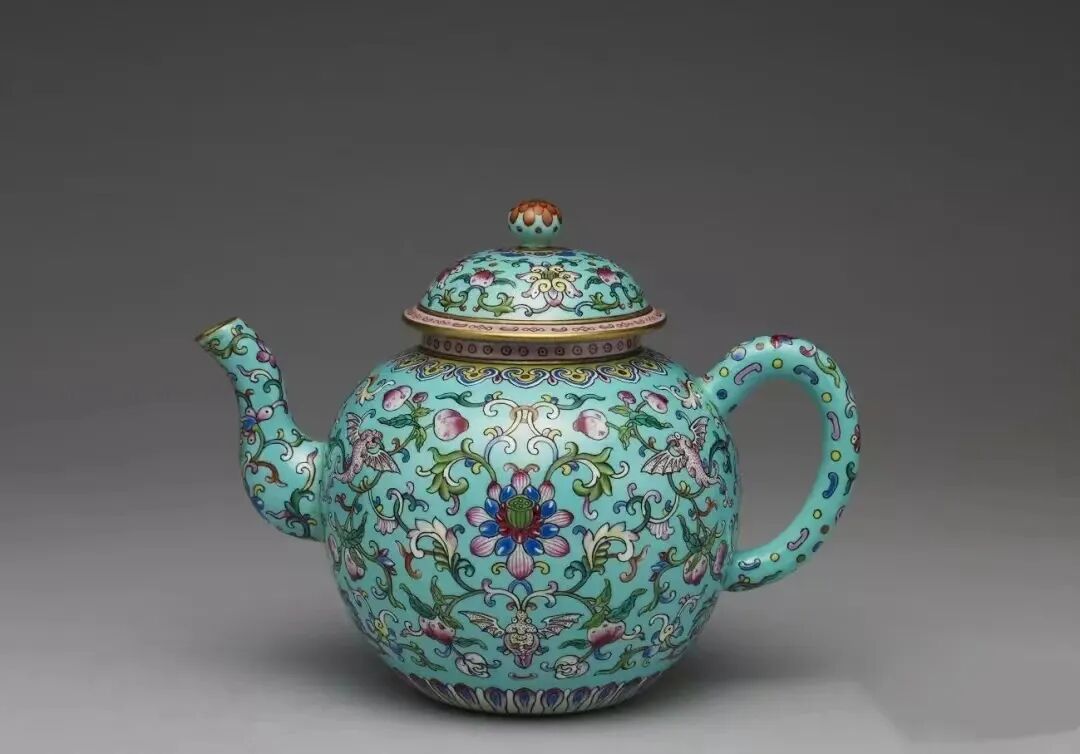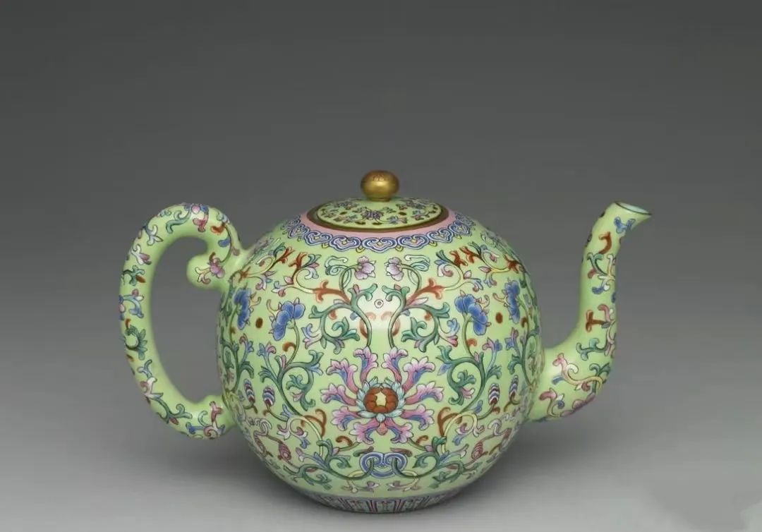 清 乾隆粉彩番莲纹绿地茶壶圆口,圆腹,凹足,曲流,弓形把,带圆纽平盖,纽侧一通气圆孔,全器以粉彩描绘纹饰,盖面花纹为四朵番莲花,中间各加饰变形枝叶,盖纽涂金,周围绘四朵花卉纹,肩饰如意纹,底边莲瓣纹一周,壶流及把手亦饰缠枝莲纹。壶内全施蓝彩,外壁则以绿彩为地,壶底蓝地中央留白,内硃红书「大清乾隆年製」六字二行篆款,此壶满施釉彩,华丽细致,造型与同时代宜兴茶壶雷同,形制或来自宜兴朱泥紫砂器。
