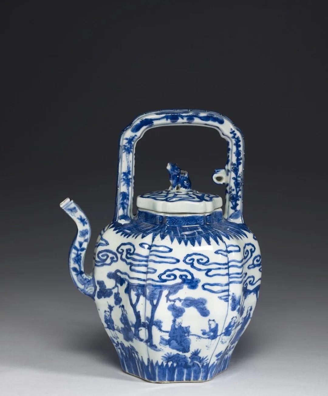 明 万历青花高士图六稜提梁茶壶