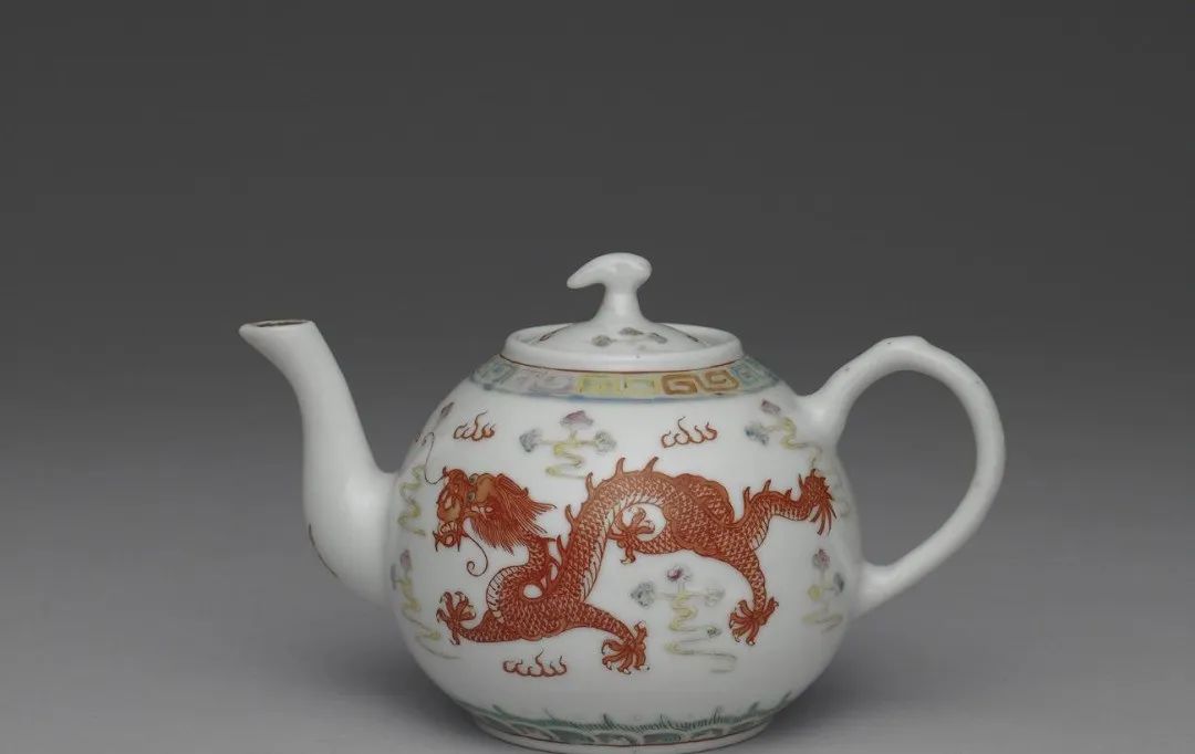 此类紫红地器,画工精密,不仅壶内外满施彩釉,壶盖内及底部,甚至圈足、盖圈足底部也全施金彩,全器画满,无一可见白胎处,虽然纹饰繁杂,但亦见锥、画工序之讲究。粉彩茶壶,壶圆口,圆身,把形弓,曲流嘴,拱形盖带几何类鸟形钮,钮侧有一通气孔,外壁饰以釉上多彩纹饰,器腹上下分别饰回纹、波涛纹各一圈,中央绘饰红彩行龙,四周缀以五彩十字祥云,图式可上溯至明代宣成时代的斗彩器,又由流上红料「寿」字看来,这或是为祝寿而制作的器物,器底红料书「大清光绪年製」二行六字楷款。欢迎关注北京陶瓷艺术馆,未来,我们会为大家带来更多精美瓷器的鉴赏。