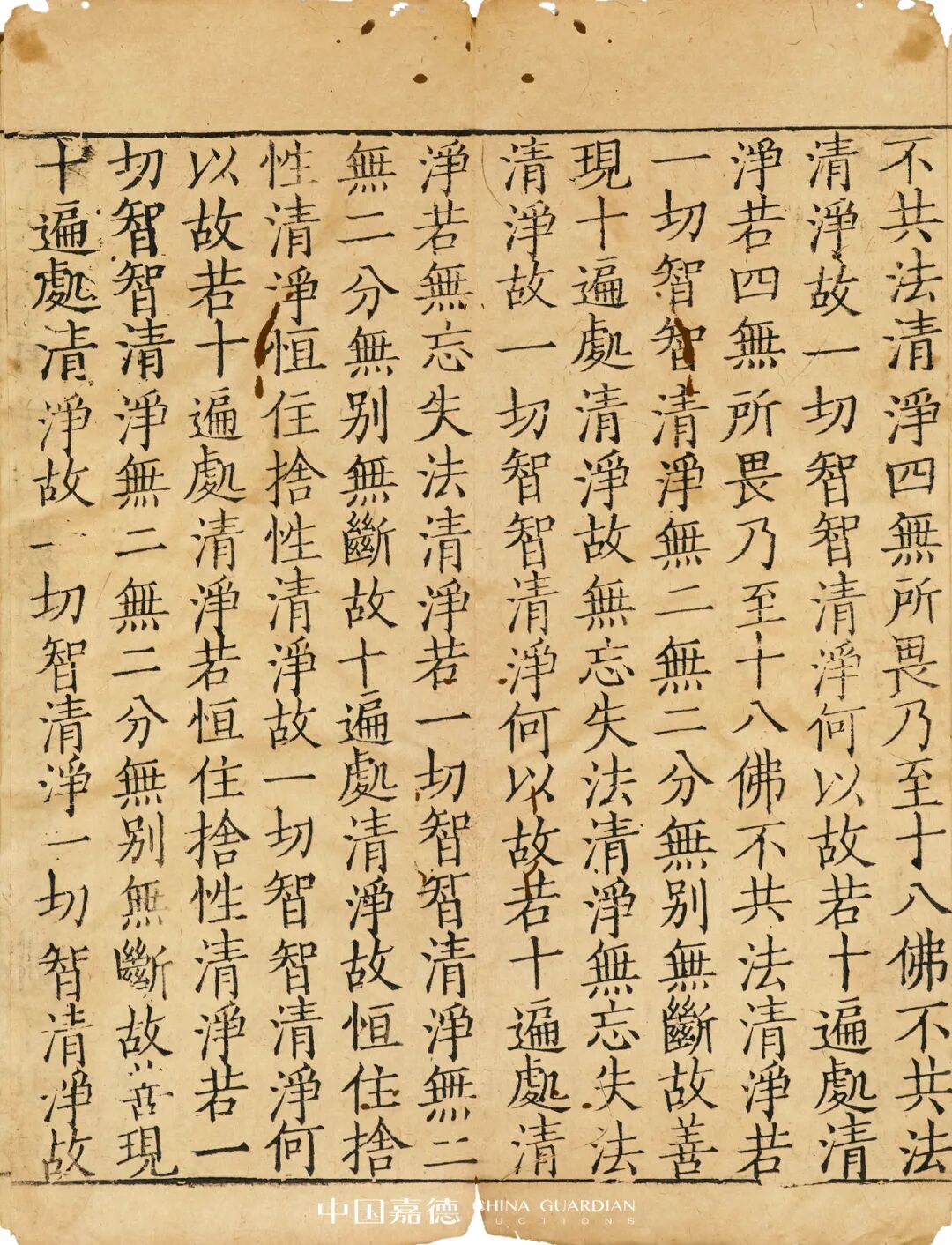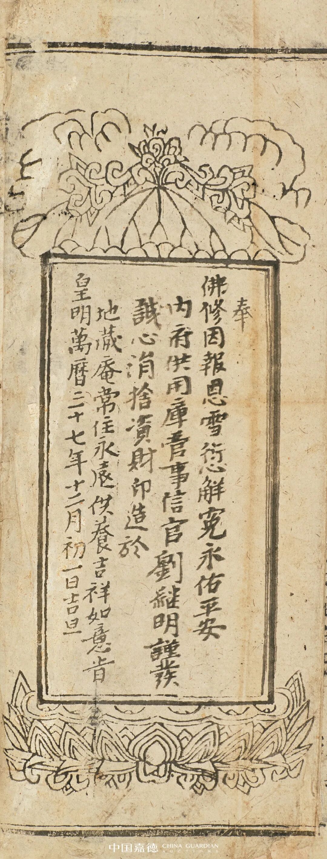 自从唐五代刻版佛经出现以来,刻本佛经就逐渐代替了写本佛经,成为信众诵读传播佛教经典的一种重要方式。此次宗教典籍专题,时间最早者为元《普宁藏》刻本《大般若波罗蜜多经卷第二百二十八》,最为珍贵的是,拍品保留了元代《普宁藏》的刊刻题记,完整记录了元代社会寺院与民间共同出资刊刻佛教大藏经的史实。