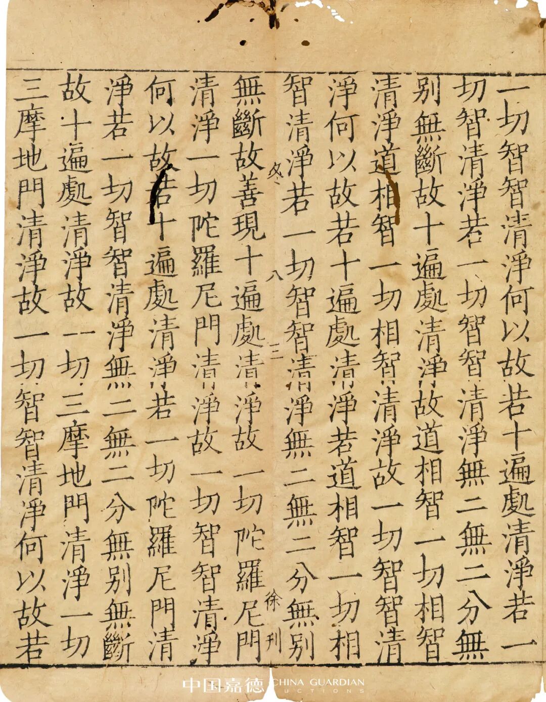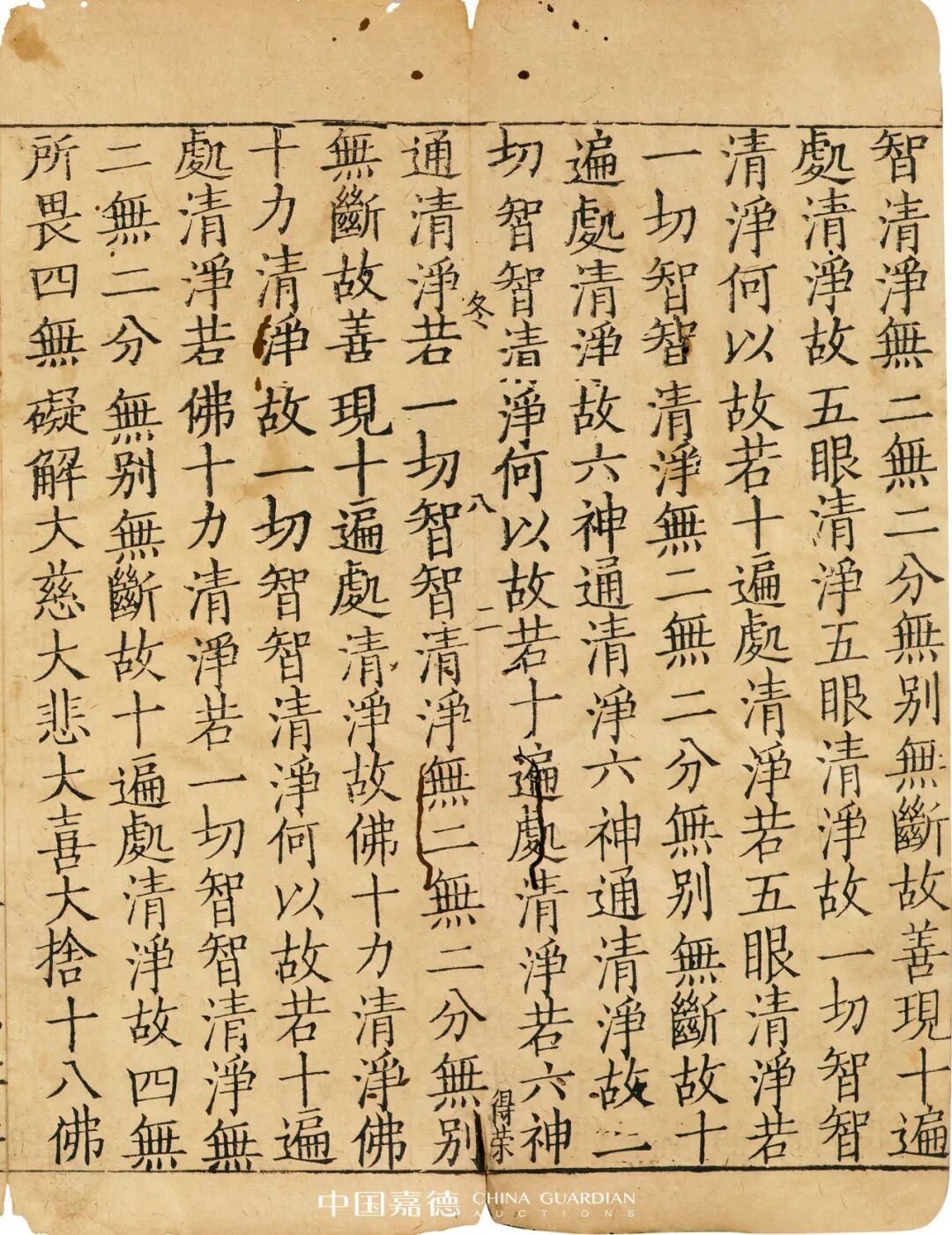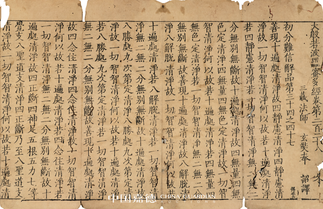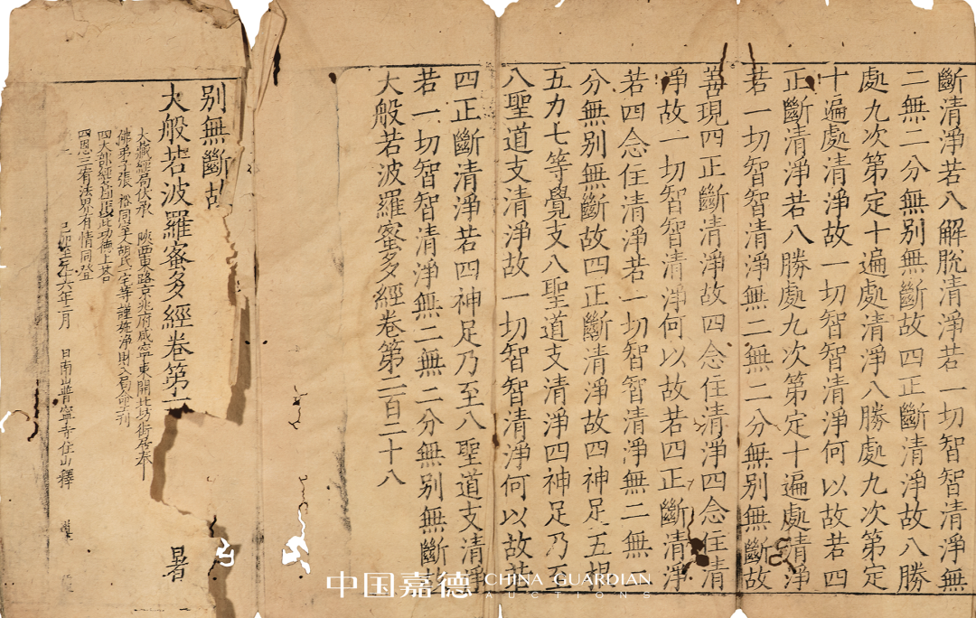 是经千字文编号“冬”,内有刻工名徐得荣、得荣、徐刊、徐等,首尾完整,略有虫蛀。另附乙卯至元十六年刻(1279)《普宁藏》本《大般若波罗蜜多经卷第□□□》(千字文编号“暑”)1折,为刊刻《普宁藏》题记,颇为稀见。