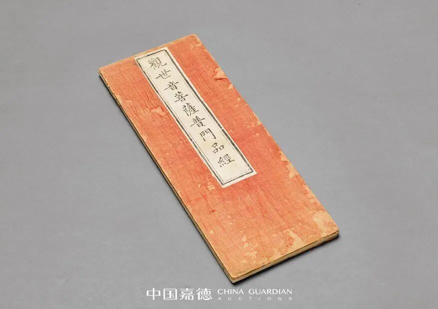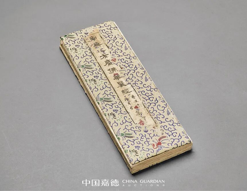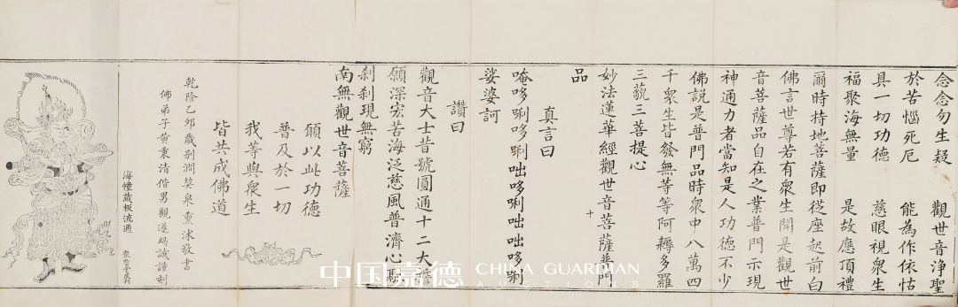 是经首有佛教题材版画5折,描摹细致,刊刻工整,全文末镌“乾隆乙卯岁别涧契泉熏沐敬书/佛弟子黄秉清偕男观遂竭诚谨刊/海幢藏板流通/聚宝堂处刊”,末有韦陀像版画。前后锦面,原装签条,品相上佳。
