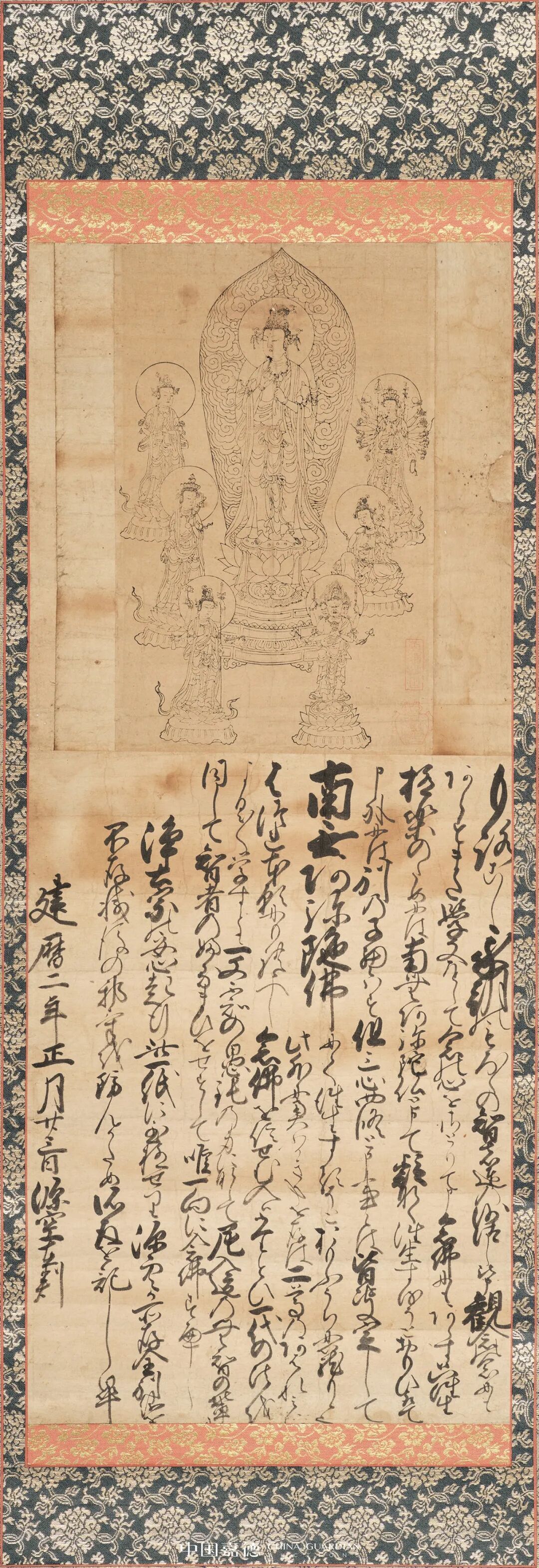 此件观世音菩萨像与日本净土宗祖师源空法师书法合裱为一轴。源空法师(1133-1212)为日本佛教净土宗祖师,创立了日本净土宗,谥号法然上人、黑谷上人、圆光大师、东渐大师、慈教大师等。源空法师所录为其所撰“一枚起请文”的全文,为其总结一生念佛修学之要旨。