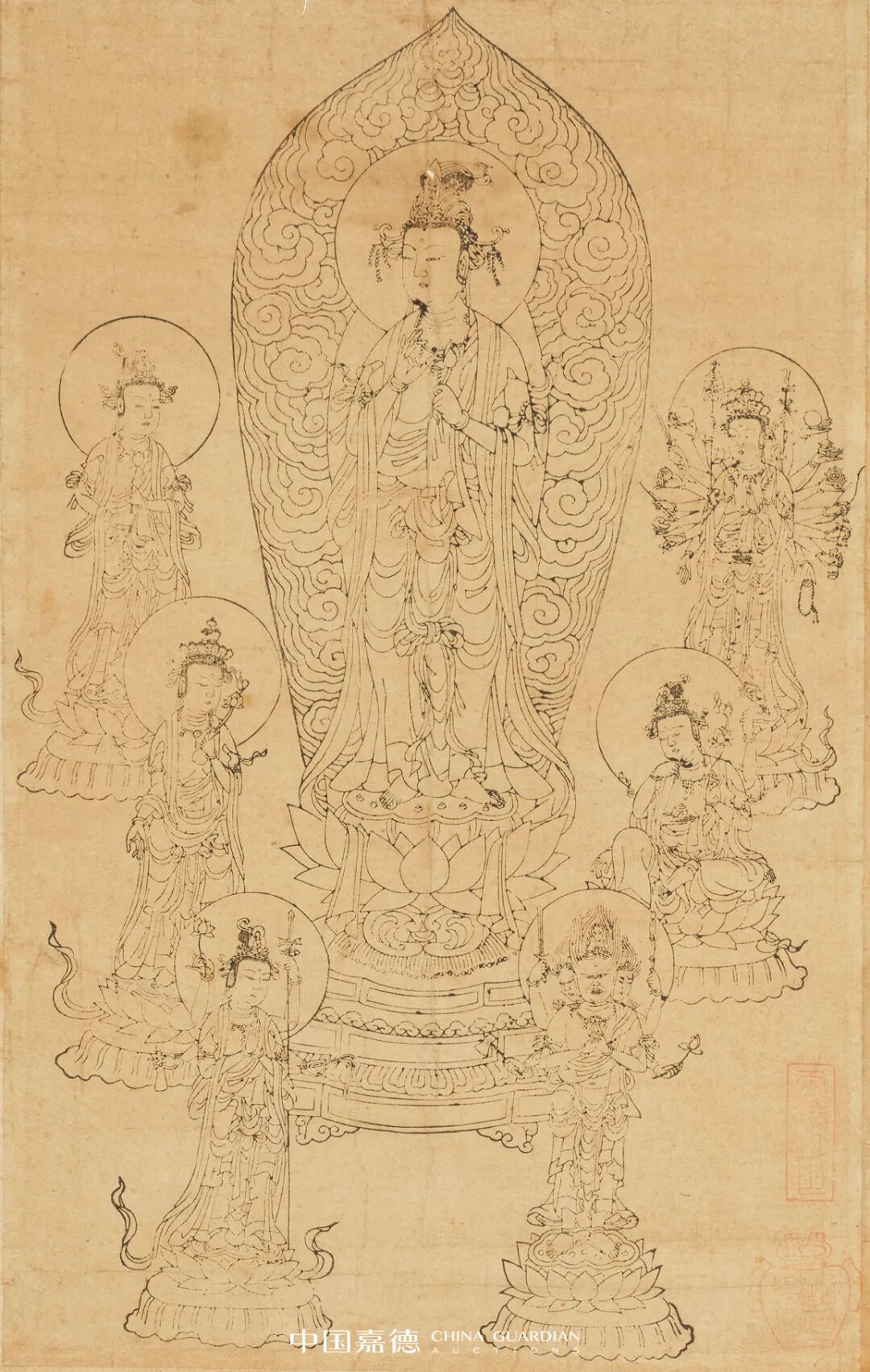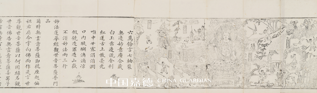 此件版画观世音菩萨执莲枝当中立于莲花座高台之上,观音身后高靠背上云纹缭绕,线条繁密。观音主像旁左右围绕着千手千眼观音、六臂观音、十一面观音等六尊观音化身法相。版画构图疏密有致,造型古朴典雅。线条刻画繁密而清楚,造像衣纹、璎珞等细节处交待的颇为清晰。