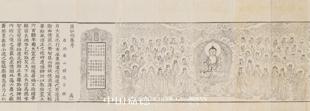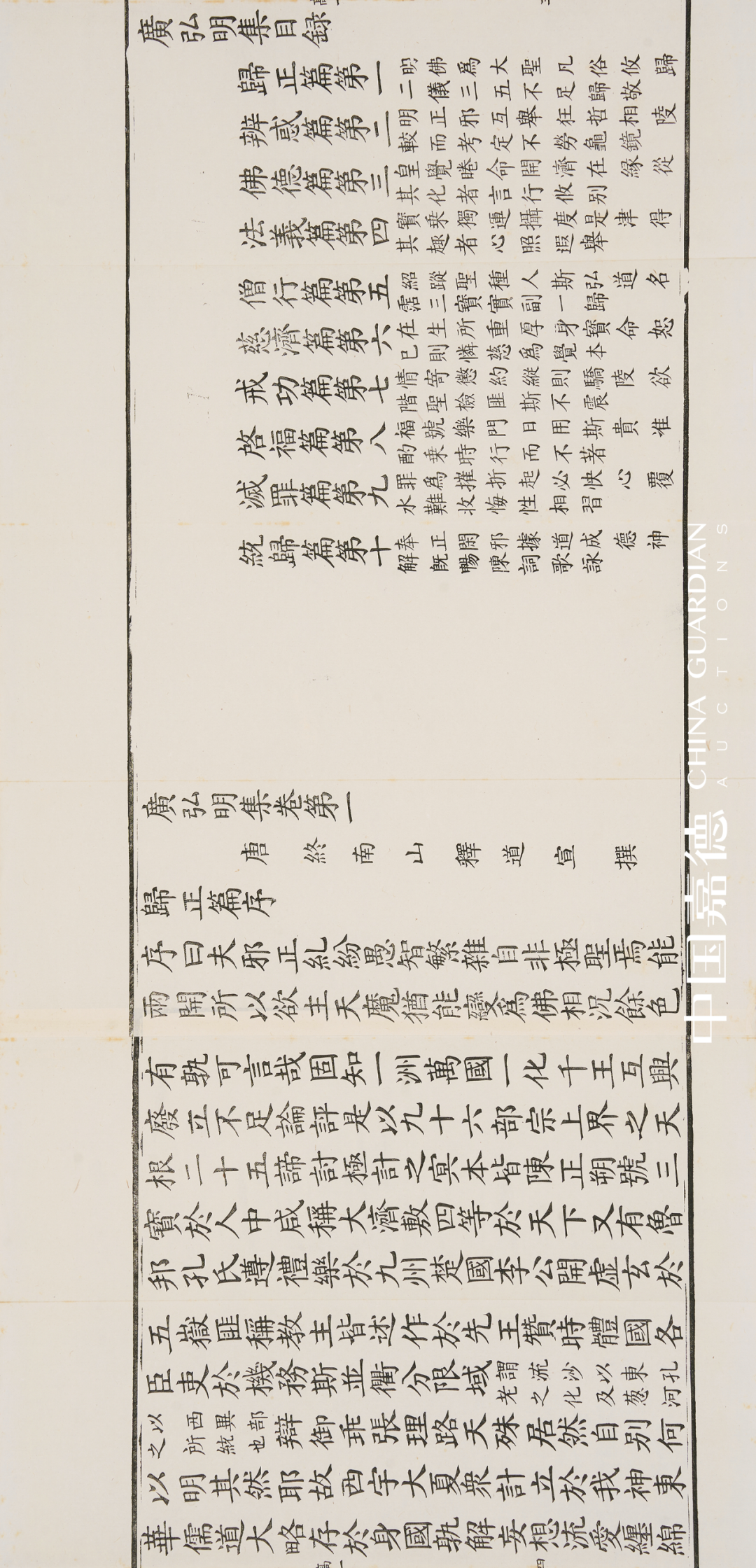 《广弘明集》系唐代京兆释道宣所编,全书继承、并扩大梁僧祐《弘明集》而作。与《弘明集》分卷不分篇不同,《广弘明集》除分卷而外,还按照所选文章的性质分为十篇,即归正、辩惑、佛德、法义、僧行、慈恻、戒功、启福、悔罪、统归,每篇之前各冠以小序。选辑有关叙述佛之祥瑞与颂扬佛之盛德文献等古今人文章,又加入作者道宣自撰的叙述与辩论的文章,最终达到作者“弘护法纲而开明有识”之目的。