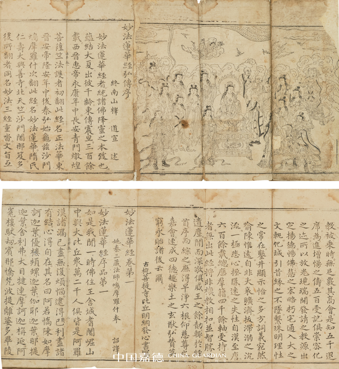 是经为佛教经典,大乘佛教初期经典之一,经中宣讲众生不分贫富贵贱,人人皆可成佛。卷首说法图版画,次《妙法莲华经弘传序》末镌“古杭菩提寺比丘明纲发心书写”,次经文正文,每卷末有音义。