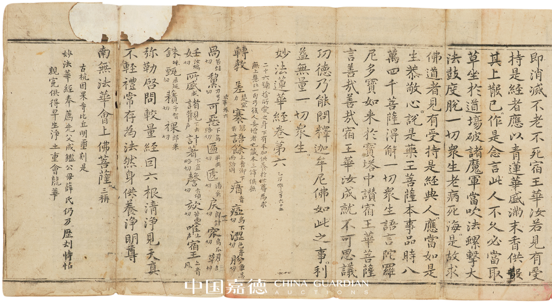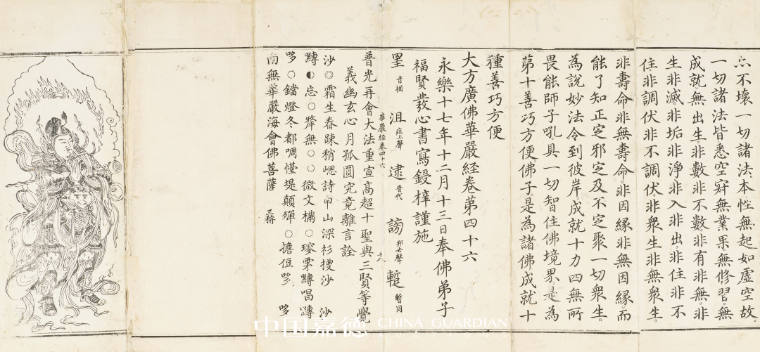是经卷首有扉画,左下角镌“太仓州报本寺方丈比丘如清本/命庚戌助刊此相愿析道心坚/固□□消除果证菩提者”,卷末镌“永乐十七年十二月十三日奉佛弟子/福贤发心书写鋟梓谨施”。后有音义,末镌韦陀像版画。有虫蛀,有修。
