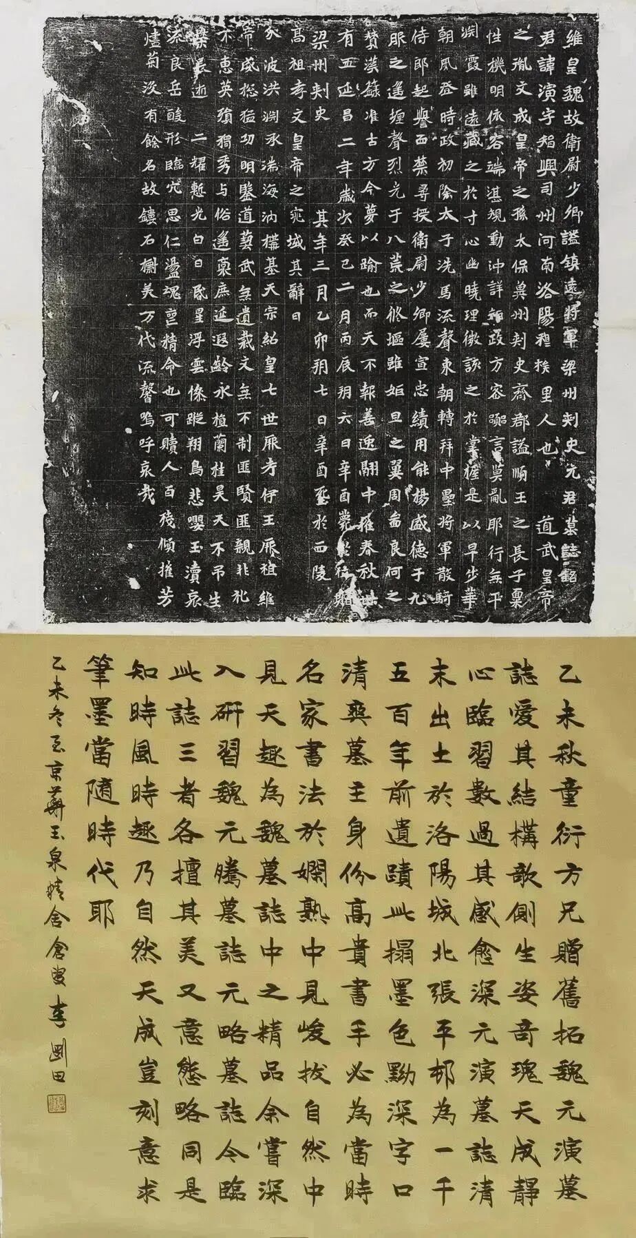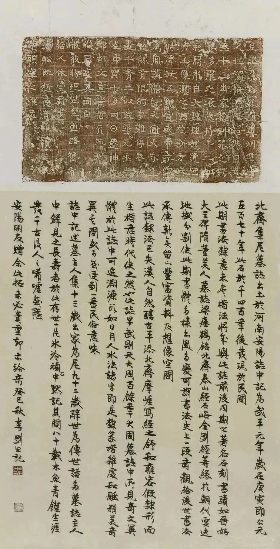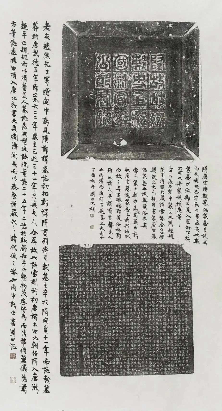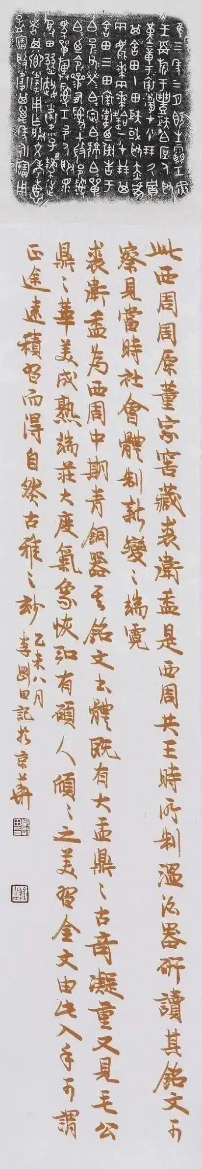 释文:乙未秋,童衍方兄赠旧拓魏《元演墓志》,爱其结构欹侧生姿、奇瑰天成,精心临习数过,其感愈深。《元演墓志》清末出土于洛阳城北张平村,为一千五百年前遗迹。此拓墨色黝深,字口清爽。墓主人身份高贵,书手必为当时名家。书法于娴熟中见峻拔,自然中见天趣,为魏墓志中之精品。余尝深入研习魏《元腾墓志》、《元略墓志》,今临此志,三者各擅其美又意态略同,是知时风时趣乃自然天成,岂刻意求笔墨当随时代耶。乙未冬至,京华玉泉精舍仓叟李刚田释文:北齐《集尼墓志》,出土于河南安阳。志中记为武平元年岁在庚寅,即公元 570 年。此石于千四百年后发现于民间。此期书法隶意未尽,楷法将成。与此志前后同期之著名石刻书迹如晋《好大王碑》、隋《董美人墓志》、梁《瘗鹤铭》、北齐《泰山经石峪金刚经》等,缘于朝代更迭、地域分割,使此期书体多样、书风多变,可谓书法史上一段奇观,给后世书法承传新变留下丰富资料及想像空间。此志隶法已失汉人自然醇古,平添北齐摩崖写经之舒和雍容,假隶形而生楷意,时代使之然也。此志早武则天大周百余年,大周墓志中所见奇文异体于此志中可追溯源头,如“日、月、人、水、法”诸字即是。隶、篆、楷杂处和融,精美奇异,其间或可感受到一番民俗意味。志中记载墓主人集13岁出家为尼,92 岁辞世,为传世诸多墓志主人中鲜见之长寿者。与此存世一片冰冷顽石中,默记其间八十载木鱼青灯生涯,发千古后人之唏嘘感慨!安阳朋友赠余此拓,未必贵重,却亦珍奇。癸巳秋李刚田记释文 :(隶书:广武县令齐显安夫妻侍佛图)此隋摩崖造像并题记朱拓。刻于开皇8年即公元588 年。造像为广武县令齐显安夫妻侍佛图,石刻完好。题记书体楷法已成隶意未尽,表现出楷书自南北朝至唐其间渐变之轨迹。题记隶书波磔笔意依稀可见,又加刀刻变异,意味亦俗亦雅,当为民间书手所书,具别样趣味。隋《董美人墓志铭》刻于开皇 17 年,仅晚此题记 9 年,而二者书风迥异,《董美人墓志》书法秀美工稳,楷法成熟,一派贵族儒雅气度,是知隋祚虽仅 37 年,但书法流派诸多,民间俗格与仕夫雅调并存共荣。延至唐初欧、虞、褚、薛,渐趋八法完美,民间具隶书意趣书法湮没无迹矣。丁酉八月李刚田。释文 :老友赵熊先生寄赠关中新见隋《郑译墓志》初拓。郑译隋书列传有载。墓主人卒于隋开皇 11 年,而志载葬于唐武德 5 年,即公元622 年,墓主已逝31年乃与夫人合葬,故此志当刻于初唐。楷书由北朝经隋入唐渐趋平正规矩,而以隋《董美人墓志》为典型,此志晚董志 25 年,二志相较,舒和平正、整饬茂密皆如,而清雅俏丽、仪态万方董志远胜。由隋入唐北朝书天真烂漫渐失,而以恭整谨严代之,时代使之然也。丙申新正,李刚田记。隋唐宋时期墓志篆盖多诡异而失规矩,去许氏六书远矣。此期篆盖求纹饰之美,入匠俗之格,不可以斯篆规模度量之。宋以后石刻中篆书渐趋规范,至清趋于严谨,当缘金石之学兴起及文人亲自书篆,唐宋墓志篆盖之诡异恶俗去矣。当下篆书创作为求异出新,取唐宋墓志篆盖之奇形怪状而效之,并言丑极即美、俗极即雅,此前人所谓兰茝馨香人之所嗜,而海畔有逐臭之夫者也。丁酉初冬刚田又补。释文此西周周原董家窖藏《裘卫盉》,是西周共王时所制温酒器。研读其铭文,可察见当时社会体制新变之端倪。《裘卫盉》为西周中期青铜器,其铭文书体既有《大盂鼎》之古奇凝重,又见《毛公鼎》之华美成熟,端庄大度,气象恢弘,有硕人颀颀之美。习金文由此入手,可谓正途,远積习而得自然古雅之妙。乙未八月,李刚田记于京华![]()