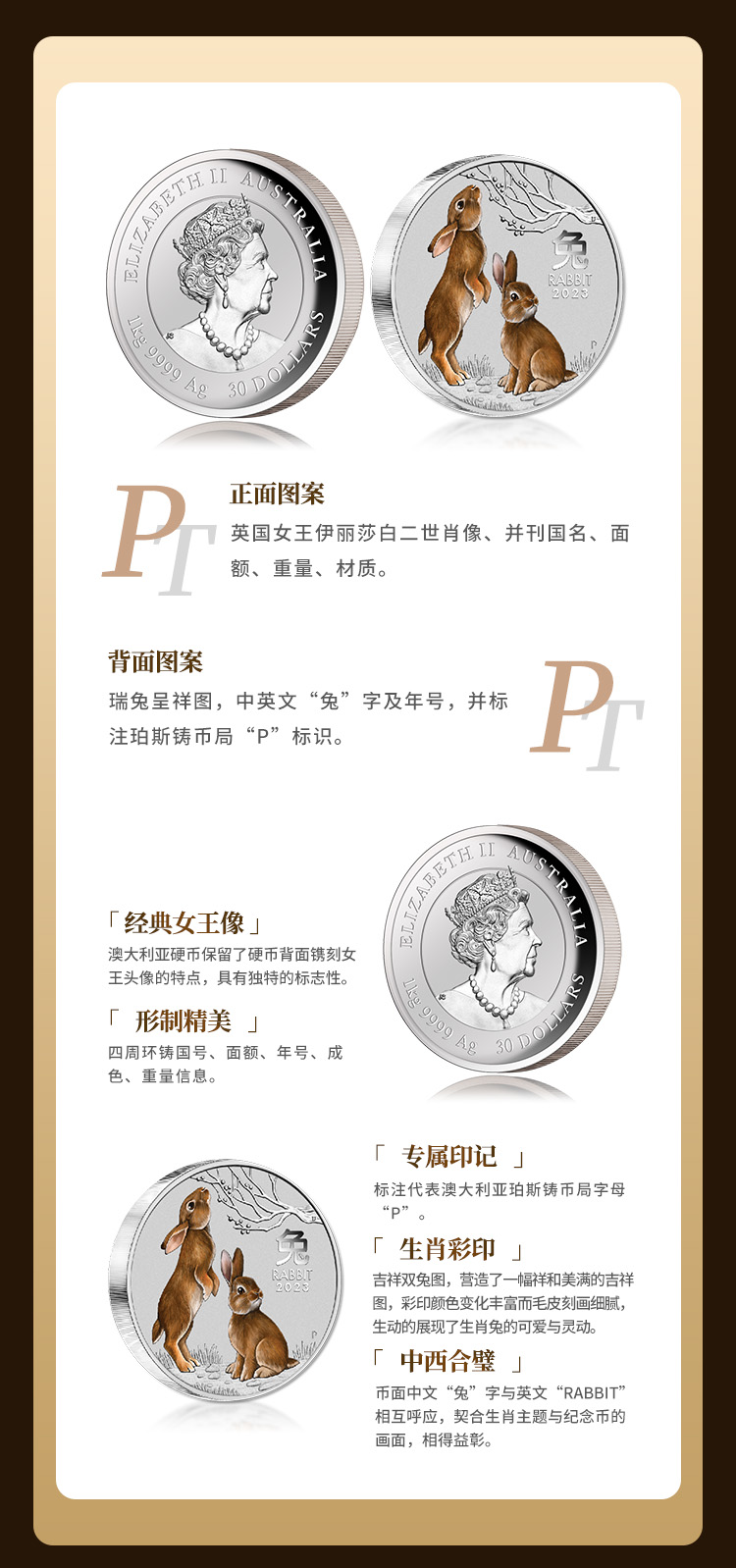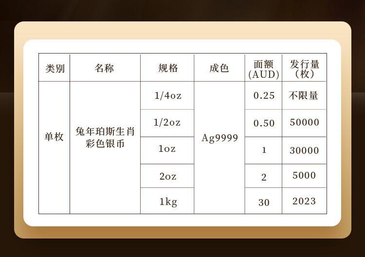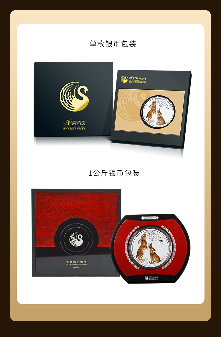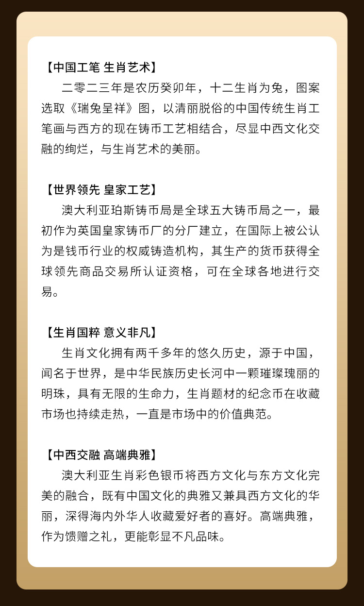 二零二三年是农历癸卯年,十二生肖为兔,珀斯生肖彩色银币以“瑞兔呈祥”为主题,选取具有浓郁中国工笔画风格吉祥图,延续澳币20年经典辉煌,再现中西合璧的生肖艺术。
