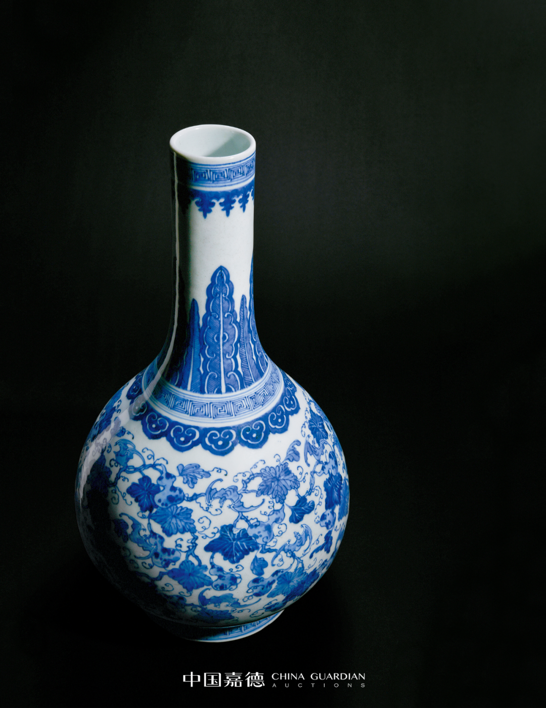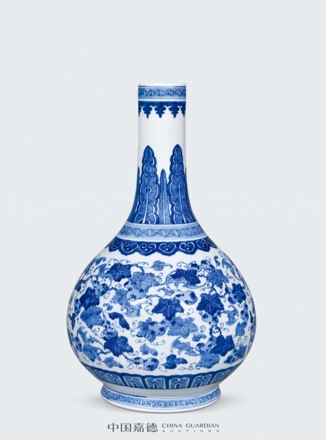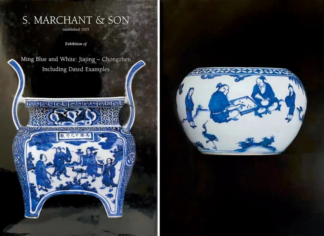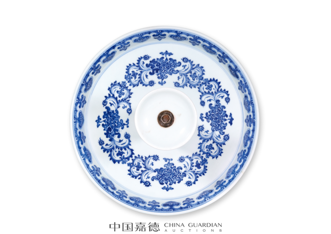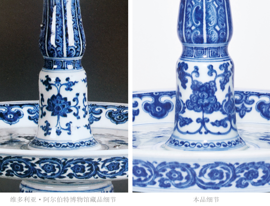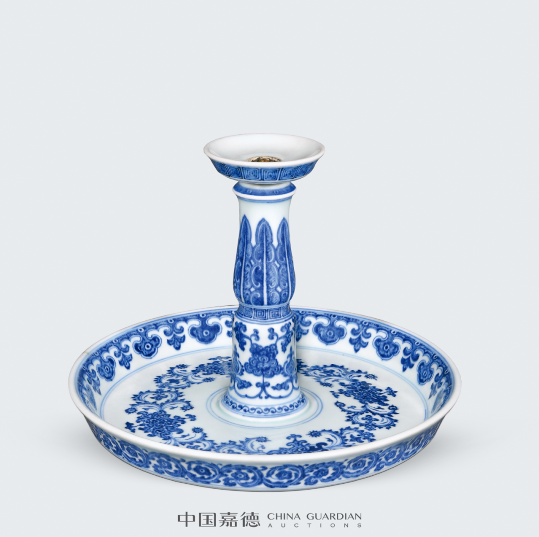 带木座瑞士收藏家Harriet Szechenyi旧藏;马钱特(S.Marchant and Son)递藏;伦敦拍卖会,2011年11月10日,Lot 130《明代嘉靖至崇祯时期青花瓷(包含具年款作品)》(Ming Blue and White: Jiajing-Chongzhen Including Dated Examples),马钱特(S.Marchant and Son),伦敦,2004年,第8、9页,图6《明代嘉靖至崇祯时期青花瓷(包含具年款作品)》(Ming Blue and White: Jiajing-Chongzhen Including Dated Examples),马钱特(S.Marchant and Son),伦敦,2004年,编号6嘉靖二十一年 (1542年)“壬寅宫变”后,嘉靖皇帝再不临朝,移居西苑(今北京北海、中南海) 一心修玄,日求长生。当时宫殿所饰之物均为道教仙人众神、灵符祥瑞之类,其中瓷器一项也不例外。本品底落嘉靖癸卯纪年款,于官窑瓷器上颇为少见,其时恰逢嘉靖二十二年,选用高士图为装饰纹样,而非道教纹样,其款识及纹饰的特殊性,具有颇高的研究及收藏价值,颇值关注。是次拍卖的作品为烛台的上半部分。流传至今的唐英自制烛台共有两对,分别为乾隆五年(1740年)十月朔日供奉于东直门外壩北长店村村二道街东口观音大士殿(德国希德深罗密博物馆藏品);乾隆六年(1741年)春月毂旦供奉于东壩天仙圣母案前(英国维多利亚·阿尔伯特博物馆藏品)。再与本品进行对比可发现,维多利亚·阿尔伯特博物馆(V&A)藏品与本件作品在蜡盘口沿外侧的卷草朵花纹、口沿内侧的如意云头纹和圆柱上方的蕉叶纹等处完全一致,唯圆柱下方纹饰有别,V&A藏品装饰折枝莲花,本品则采用双犄牡丹。胆瓶始烧于唐代,盛行于宋代,是古代瓷瓶典雅器型之代表,清代御窑亦喜此式。明末《瓶花谱》记曰:“瓷器以各式古壶、 胆瓶、尊、觚、一枝瓶为书室中妙品”。胆瓶尤适合供单枝长茎花草,常被用作花器。纵观传世的清代胆式瓶,以单色釉为最多,青花色者尚并不多见,而如本品造作如此精雅者,更是举世难寻,当值珍藏佳品。晚清此式赏瓶若此般大体量者较为罕见,粉彩者常见以百蝠、百蝶为饰,有一类装饰云龙或者龙凤者,颈部以八宝为饰,主题纹饰布局与本品相类。而本品以青花粉彩为饰,青花点缀口、肩、胫,增色不少。更为难得者,本品体量硕大,成对出现,装饰效果极佳,实为收藏尚选。