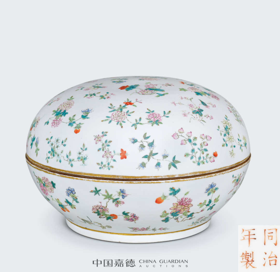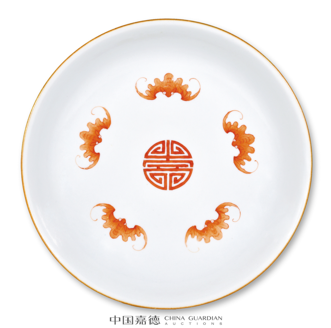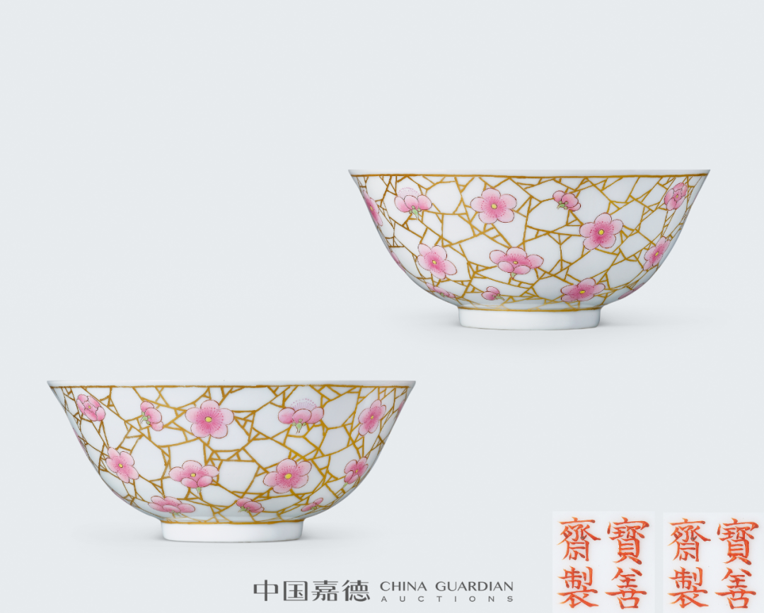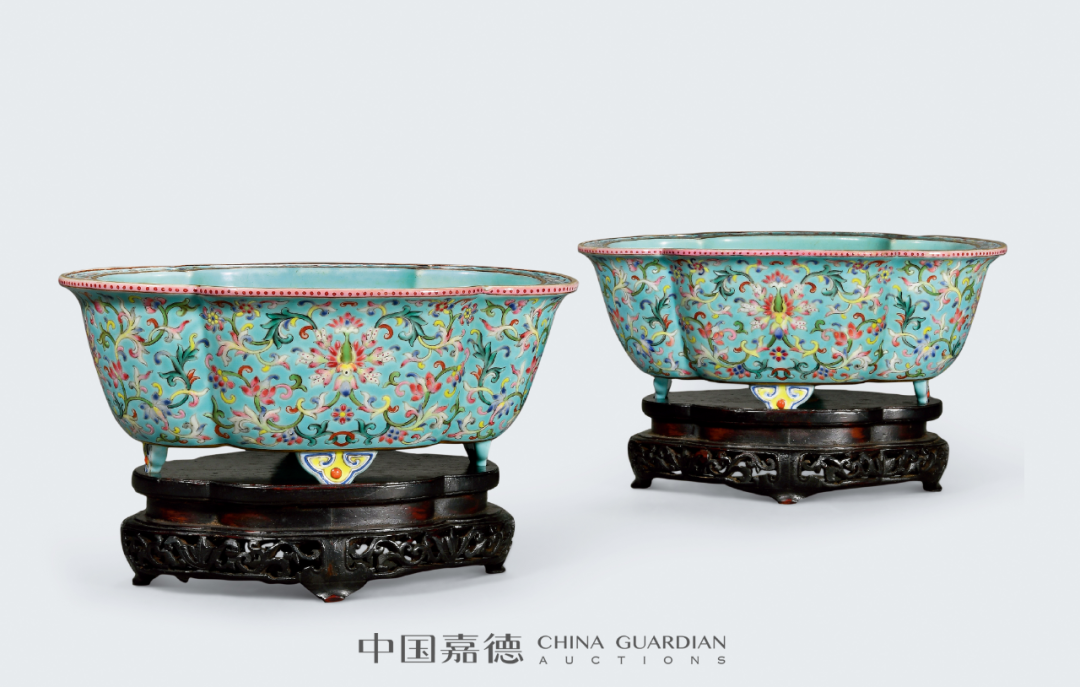 常见的光绪粉彩赏瓶,以百蝠、百蝶为饰。云龙者相对少见,另有龙凤为饰者,亦有于颈部装饰八宝纹饰者。本品最为独特之处在于其体量硕大,高度达66公分,气势恢宏,颇具装饰效果。本品与本场Lot2622青花粉彩云龙纹大赏瓶一对相类,对读成趣。捧盒因其无系、无钮,形体较大,移动只能以手捧之而得名。捧盒盖、身分开烧制,做子母口相合,制作工艺复杂,稍有不慎,便前功尽弃。本品体量较大,然其子母口套合相当严密,俨如一体,烧制成型极为不易。而且存世亦为少见,故宫博物院藏有一件同类型作品,可资比较。中国嘉德,2006年11月22日,Lot 2258“冰梅纹”又称“冰裂梅花纹”,创制于清康熙朝,以仿宋官窑冰裂片纹为地,并于其上画朵梅或枝梅的装饰纹样。景德镇窑冰梅纹多以青花或五彩作画,尤以青花作画者最为常见,多饰于瓶、罐、盘等器物上。粉彩绘梅花较之青花品种,更为雅致鲜活。本品未落本朝款而落“宝善堂制”堂名款,与清雅的冰梅纹饰相得益彰。仿生釉色开光墨彩山水的笔筒,最著名者当属故宫博物院所藏雍正仿木纹釉开光墨彩山水人物纹大笔筒,虽仿生釉色不同,但创作理念相类。故宫者为通景描绘,而本品采用四面开光,选用四季山水,各有意趣。同时,此式墨彩四季山水纹样亦广泛应用于乾隆洋彩作品中,值得关注。瓷质花盆是实用器皿,主要供后寝生活区与京郊各处皇家园林使用,尤其户外养植需用甚多,因此瓷质花盆也有室内与户外之别,从而影响到花盆的形制设计。室内者需要花盆与盆奁相配套使用,花盆底部有洞,下以盆奁相托,如此设计可泄水通气,有利花卉生长,以尺幅小巧者居多,养植只适合室内生 长的观赏植物,本品即为此类。南京博物院所藏乾隆瓷质花盆较为丰富,其中有一件相同造型者,黄地洋彩装饰,纹饰布局相类,可资比较。内矾红五蝠捧寿图外黄地洋彩缠枝牡丹开光“甲子万年”盘一对甲子万年为歌颂皇帝万寿无疆、江山永固的吉语,是清代宫廷器物中常见的装饰题材,清代督陶官唐英即曾在乾隆八年(1743年)进折中称:“于十月内在窑厂办理瓷务,因是时工匠皆齐集,复敬谨造得万年甲子笔筒一对,回圈如意,幅辏连绵,工匠人等以开春正当甲子万年之始,悉皆欢腾踊跃。”嘉庆九年(1804年)为甲子年,应为嘉庆帝效仿乾隆所制,意在承继传统,永保一统江山的美好愿望。本品画面构图巧思,寓意吉祥美好,成对传世更显难得珍贵。本品纹饰细腻,色彩明媚,琳琅满目,美不胜收,展现出一种清丽与华贵相并的唯美气息,使人观之悦目娱心,称心快意。成对保存,甚是难得,极富收藏价值。![]()