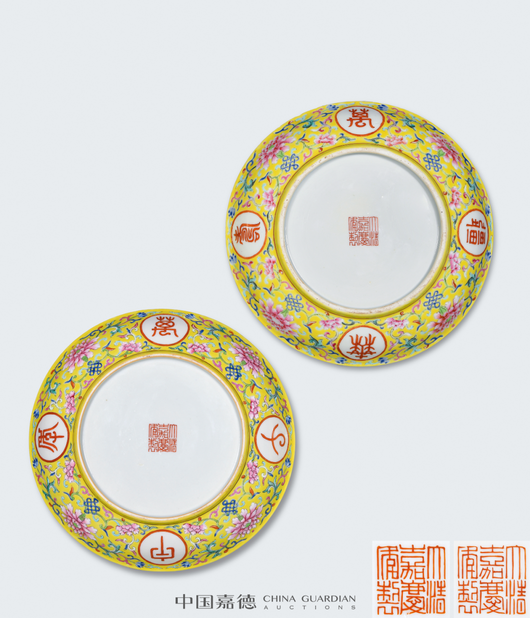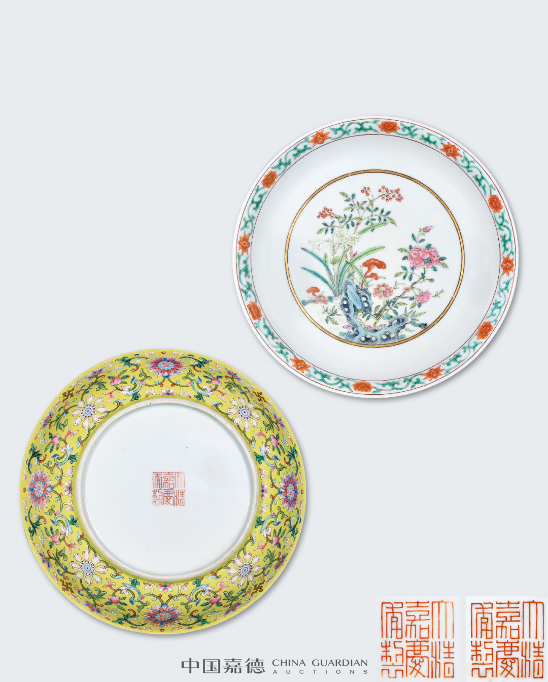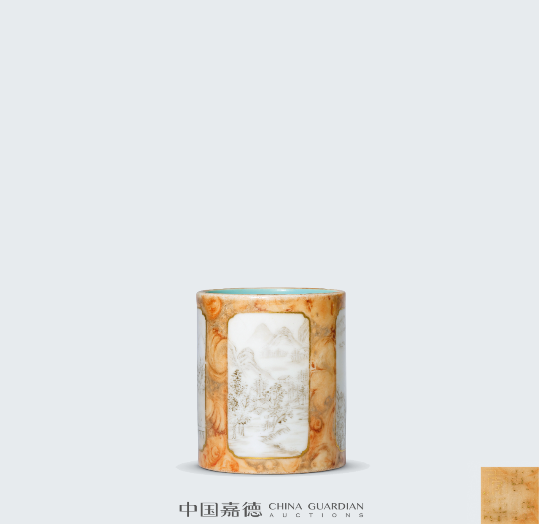 常见的光绪粉彩赏瓶,以百蝠、百蝶为饰。云龙者相对少见,另有龙凤为饰者,亦有于颈部装饰八宝纹饰者。本品最为独特之处在于其体量硕大,高度达66公分,气势恢宏,颇具装饰效果。本品与本场Lot2622青花粉彩云龙纹大赏瓶一对相类,对读成趣。捧盒因其无系、无钮,形体较大,移动只能以手捧之而得名。捧盒盖、身分开烧制,做子母口相合,制作工艺复杂,稍有不慎,便前功尽弃。本品体量较大,然其子母口套合相当严密,俨如一体,烧制成型极为不易。而且存世亦为少见,故宫博物院藏有一件同类型作品,可资比较。中国嘉德,2006年11月22日,Lot 2258“冰梅纹”又称“冰裂梅花纹”,创制于清康熙朝,以仿宋官窑冰裂片纹为地,并于其上画朵梅或枝梅的装饰纹样。景德镇窑冰梅纹多以青花或五彩作画,尤以青花作画者最为常见,多饰于瓶、罐、盘等器物上。粉彩绘梅花较之青花品种,更为雅致鲜活。本品未落本朝款而落“宝善堂制”堂名款,与清雅的冰梅纹饰相得益彰。仿生釉色开光墨彩山水的笔筒,最著名者当属故宫博物院所藏雍正仿木纹釉开光墨彩山水人物纹大笔筒,虽仿生釉色不同,但创作理念相类。故宫者为通景描绘,而本品采用四面开光,选用四季山水,各有意趣。同时,此式墨彩四季山水纹样亦广泛应用于乾隆洋彩作品中,值得关注。瓷质花盆是实用器皿,主要供后寝生活区与京郊各处皇家园林使用,尤其户外养植需用甚多,因此瓷质花盆也有室内与户外之别,从而影响到花盆的形制设计。室内者需要花盆与盆奁相配套使用,花盆底部有洞,下以盆奁相托,如此设计可泄水通气,有利花卉生长,以尺幅小巧者居多,养植只适合室内生 长的观赏植物,本品即为此类。南京博物院所藏乾隆瓷质花盆较为丰富,其中有一件相同造型者,黄地洋彩装饰,纹饰布局相类,可资比较。内矾红五蝠捧寿图外黄地洋彩缠枝牡丹开光“甲子万年”盘一对甲子万年为歌颂皇帝万寿无疆、江山永固的吉语,是清代宫廷器物中常见的装饰题材,清代督陶官唐英即曾在乾隆八年(1743年)进折中称:“于十月内在窑厂办理瓷务,因是时工匠皆齐集,复敬谨造得万年甲子笔筒一对,回圈如意,幅辏连绵,工匠人等以开春正当甲子万年之始,悉皆欢腾踊跃。”嘉庆九年(1804年)为甲子年,应为嘉庆帝效仿乾隆所制,意在承继传统,永保一统江山的美好愿望。本品画面构图巧思,寓意吉祥美好,成对传世更显难得珍贵。本品纹饰细腻,色彩明媚,琳琅满目,美不胜收,展现出一种清丽与华贵相并的唯美气息,使人观之悦目娱心,称心快意。成对保存,甚是难得,极富收藏价值。![]()