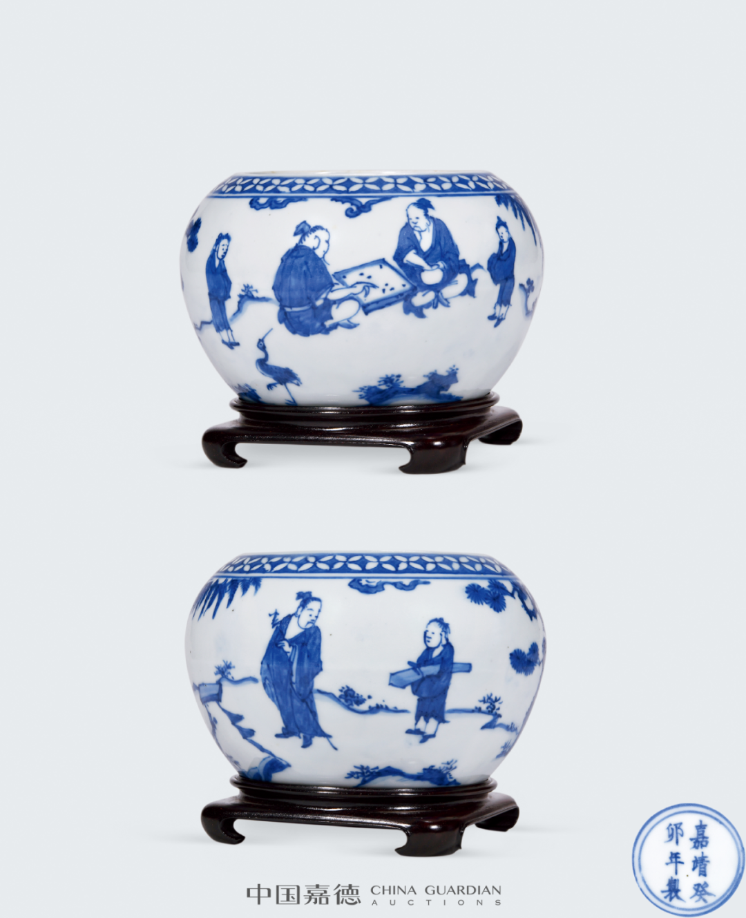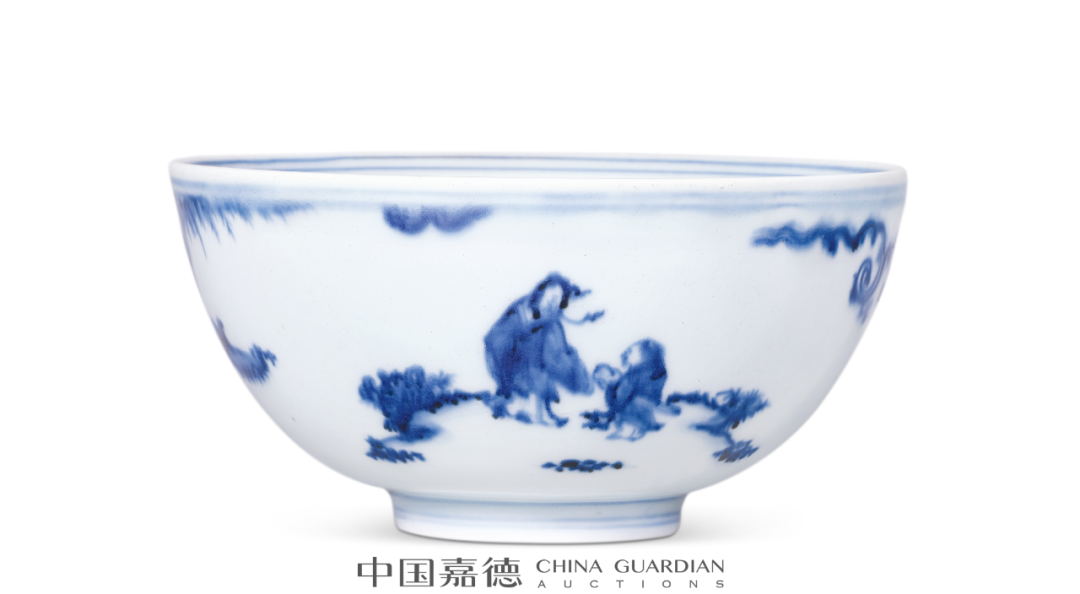 香港拍卖会,1993年10月25日,Lot 722碗内绘青花铁拐李渡汉钟离人物故事图,画面远景仙山耸立,云气氤氲。中景见铁拐李和汉钟离二人正醉卧于酒坛边,谈笑风生。晋朝时,汉钟离为周处副将,在一次战斗中打了败仗,逃入终南山修道,遇到东华先生(铁拐李)等五位真人,最终得道归隐。本品所绘即为此则故事。诸葛碗为双层碗壁中空的碗式,设计独特,最早出现于宋代,明代中期开始流行,持续至明晚期。“嘉靖癸卯年(1543年)制”六字双行楷书款,嘉靖本朝
